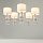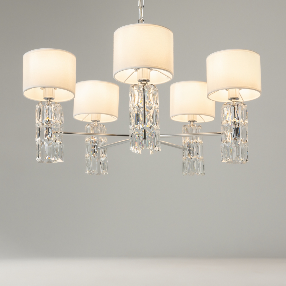 Сочетание хромированной арматуры и белых тканевых абажуров на ПВХ-основе.