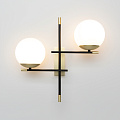 Металлическая арматура с плафонами-сферами из матового стекла формирует выразительный визуальный акцент.