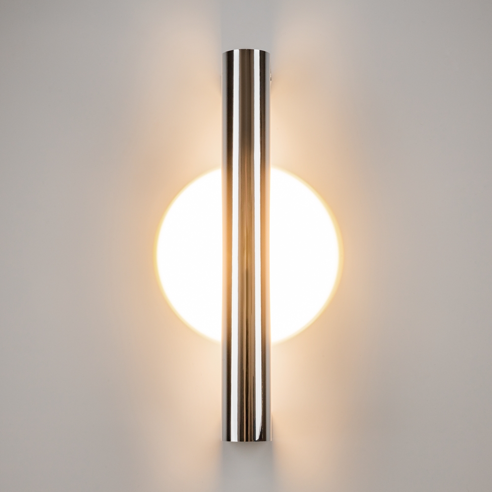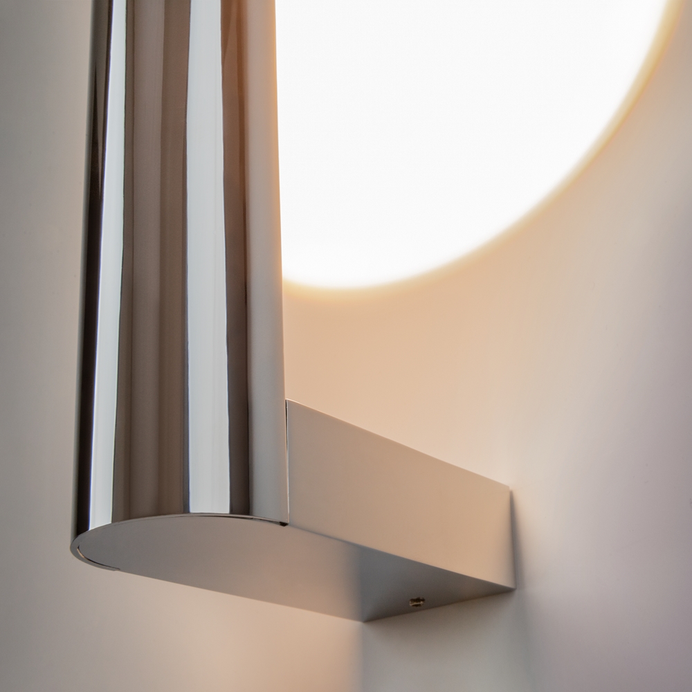 Глянцевая полузеркальная поверхность арматуры, отражаясь и бликуя, делает светильник визуально тоньше.