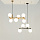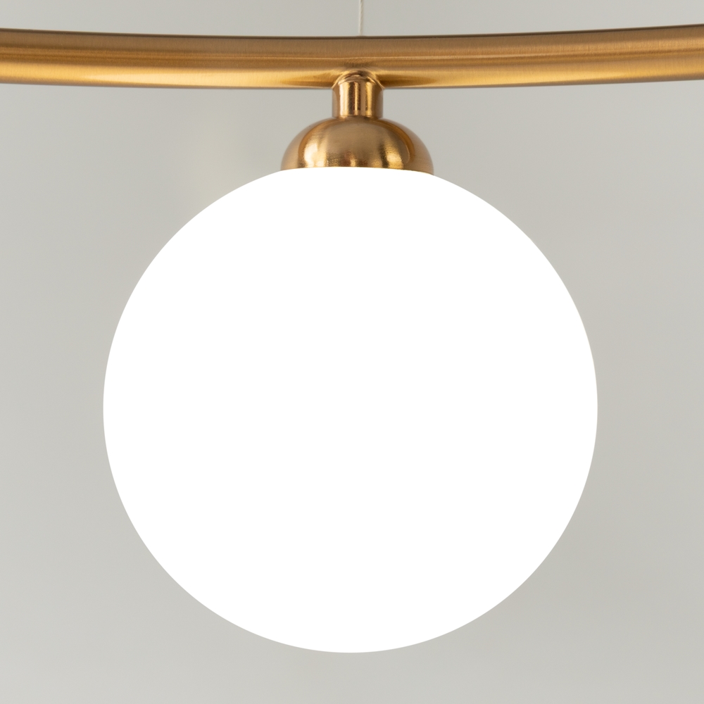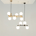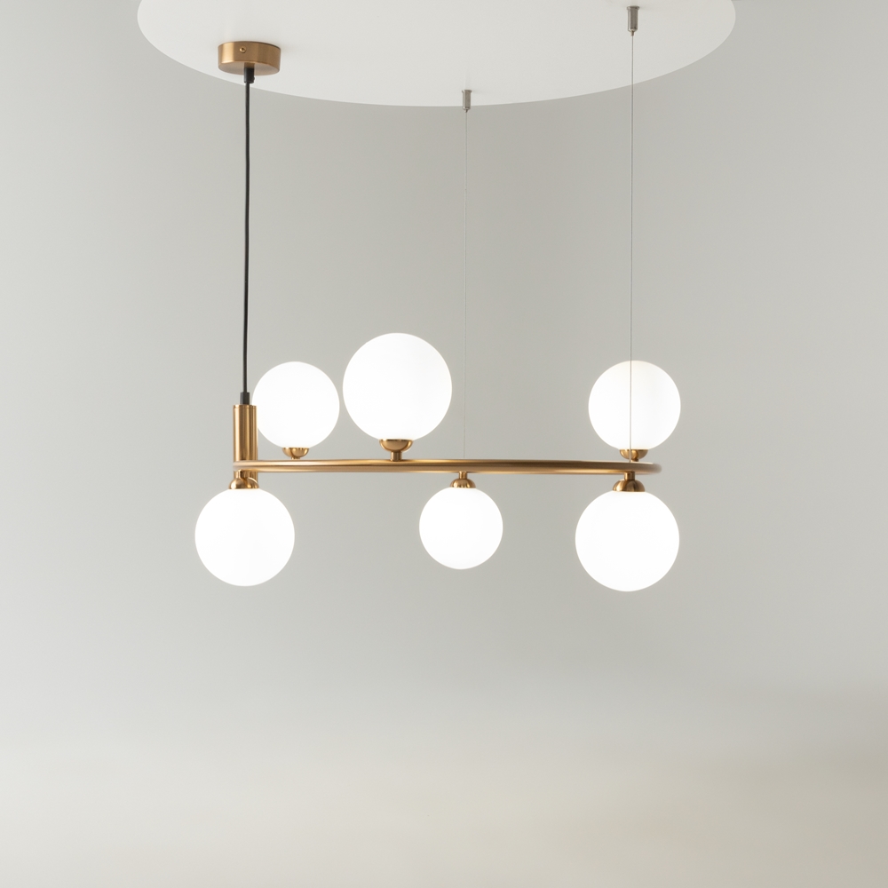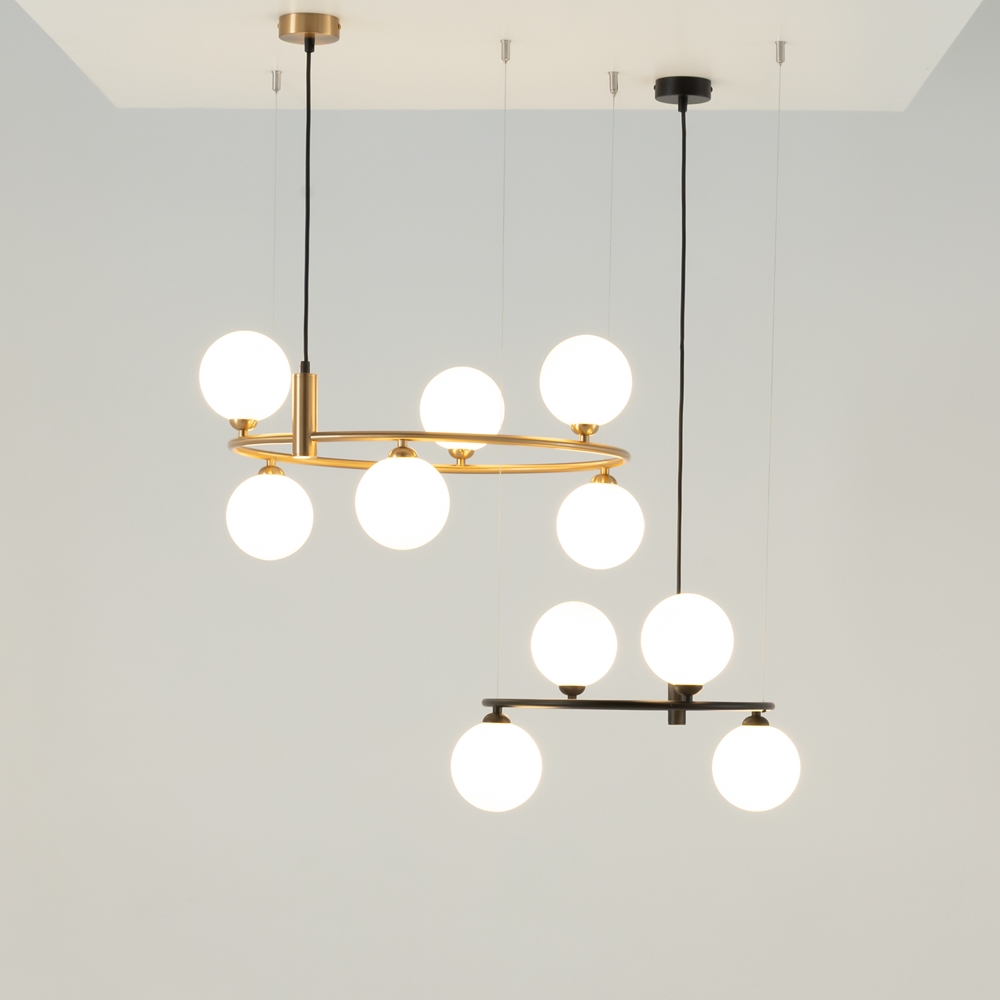 Округлый металлический каркас с матовыми стеклянными плафонами создаёт эффект невесомости, органично вписываясь в современные интерьеры.