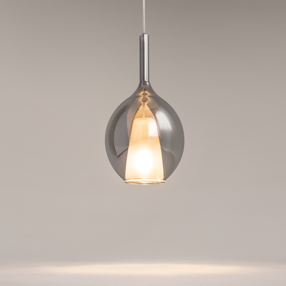 Название серии Duality — двойственность — отражает конструктивную особенность светильника. Двойные плафоны из выдувного стекла с трендовым гальваническим покрытием цвета зеркальные золото, кофейный, дымчатый, а также градиентный белый – выдержанно подчёркивают необычную геометрию светильника. Многообразие цветов, а также форм плафонов позволяет фантазии творить неисчислимое множество уникальных композиций из светильников серии. Внутренний плафон выполнен из матового стекла и имеет форму конуса. Арматура черного цвета поддерживает единообразие серии. Высота подвесных светильников регулируется, максимальная длина провода — 3 метра. Подходит для помещений с высокими потолками, где новые формы и цветовые решения позволяют создавать еще более впечатляющие световые инсталляции.