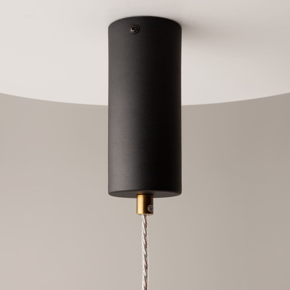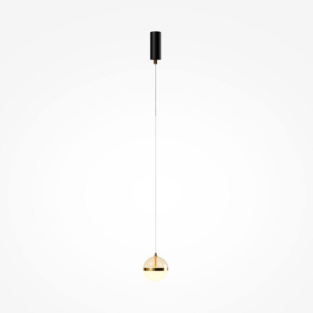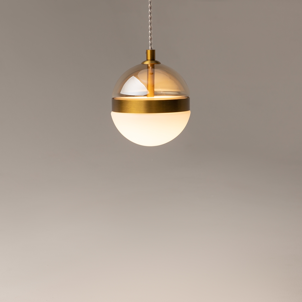 Нижняя полусфера выполнена из матового белого стекла – оно дает мягкий рассеянный свет, наполняющий уютом пространство. Верхняя полусфера изготовлена из тонированного стекла теплого янтарного оттенка. Их разделяет яркая металлическая кромка в цвете латунь с блестящим сатинированным покрытием – это одновременно и функциональный элемент, и декоративная деталь.