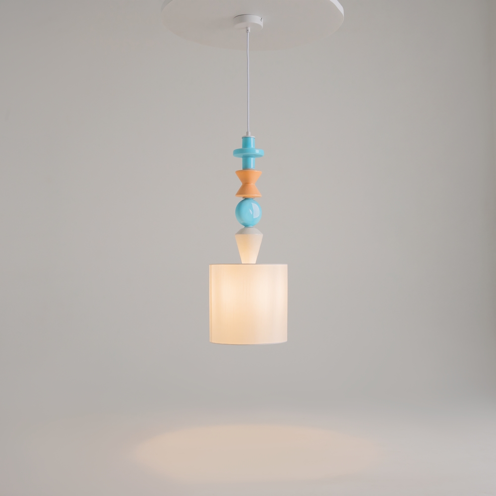 Белый абажур дополняют цветные керамические детали, контрастное сочетание оттенков хорошо смотрится и привлекает внимание. Светильник превратится в оригинальный акцент в интерьере.