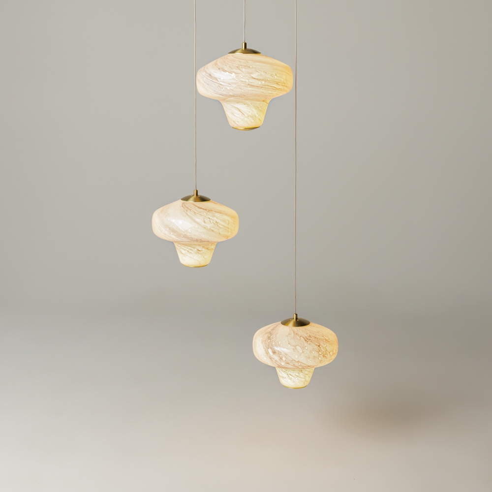 Каждый светильник представляет собой маленькую историю о совместном путешествии двух стихий. Форма плафона напоминает вихрь воздушных потоков, а нанесенный рисунок символизирует эффектный танец поднявшихся ввысь песчинок.