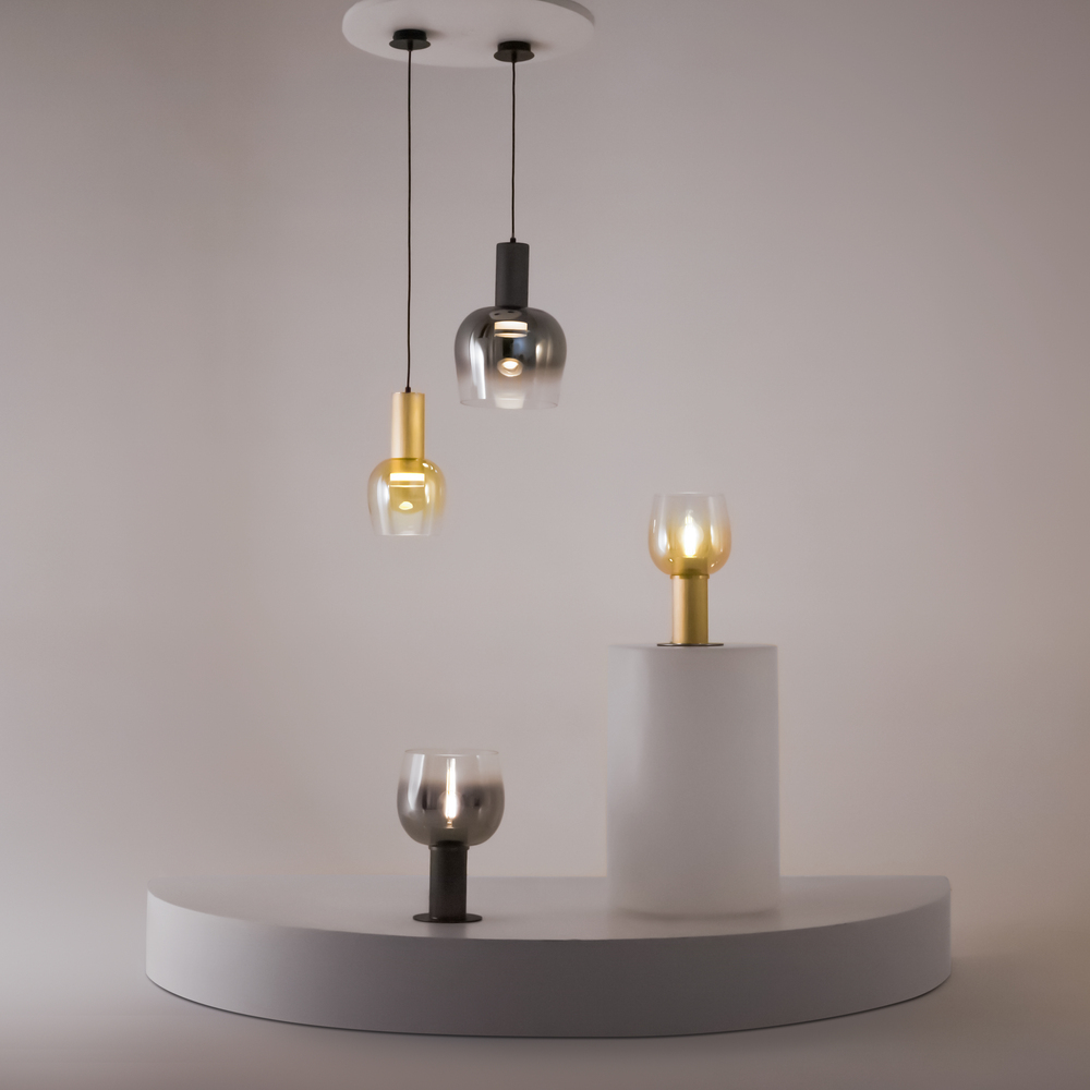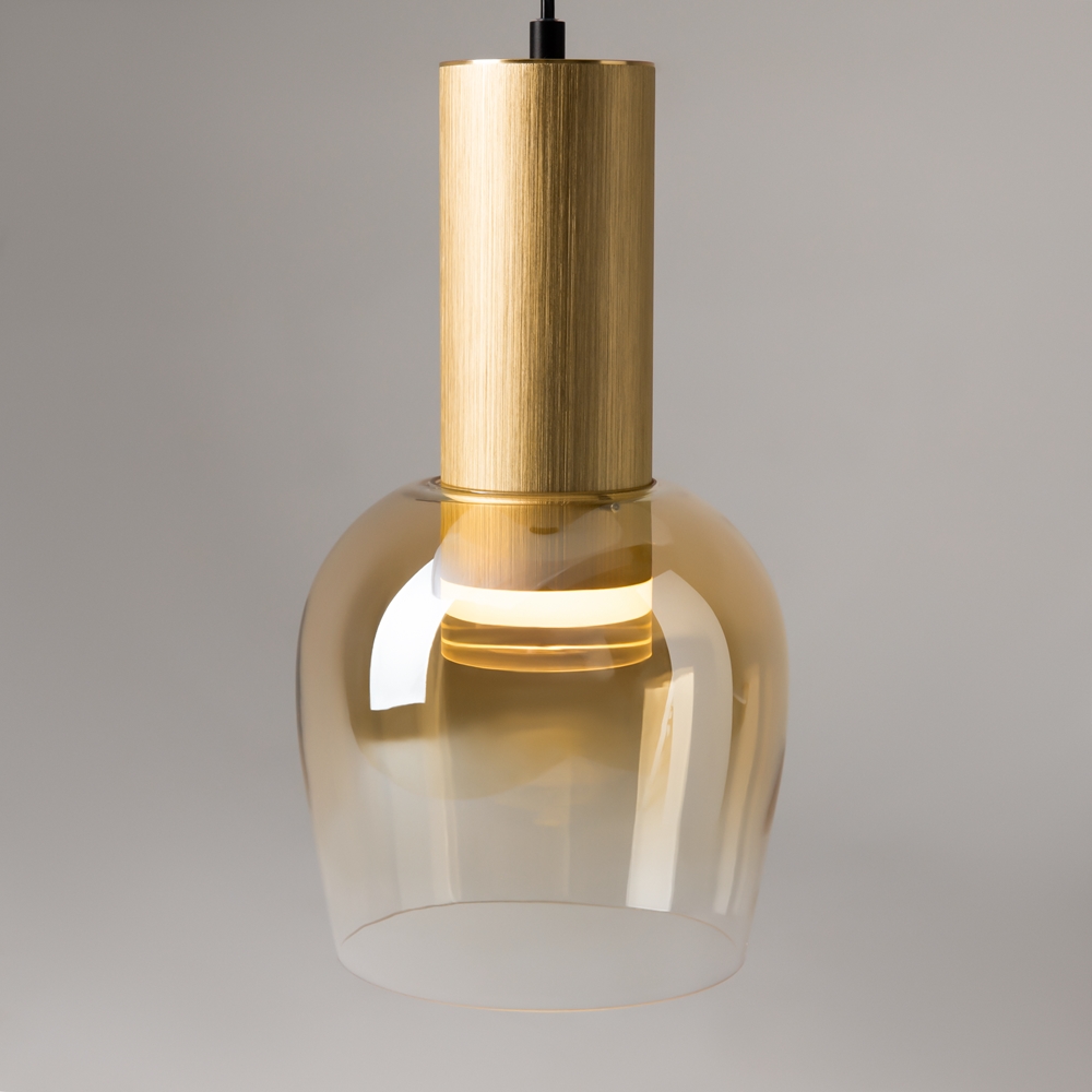 Объемные плафоны из выдувного стекла с градиентным окрашиванием станут акцентным декоративным элементом в интерьере. Дымчато-серый или насыщенно-янтарный цвета переходят в почти прозрачный – такое решение создает воздушный парящий эффект. Арматура может иметь цвет глянцевого золота или черное покрытие с антибликовым эффектом. Сочетание плафонов разных диаметров оригинально смотрится в каскадной композиции.