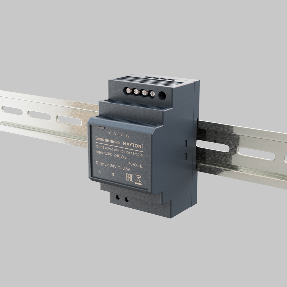Источник напряжения PSL016-60W-24V-IP20-HDR с гальванической развязкой для светодиодных изделий, подходит для монтажа на DIN-рейку, благодаря стандартизированному креплению. Небольшие габариты позволяют размещать блоки питания в электрические щиты и ниши.