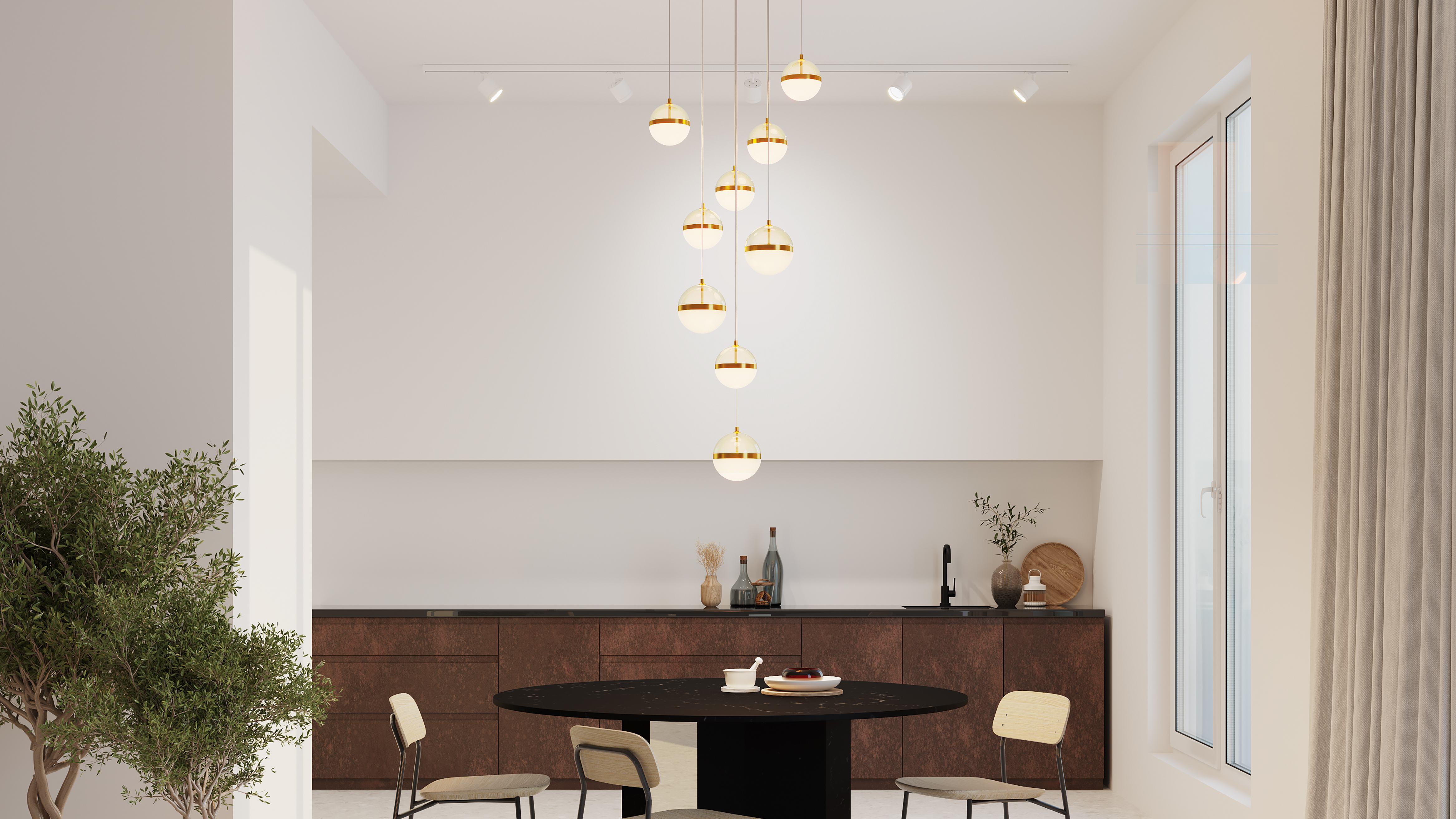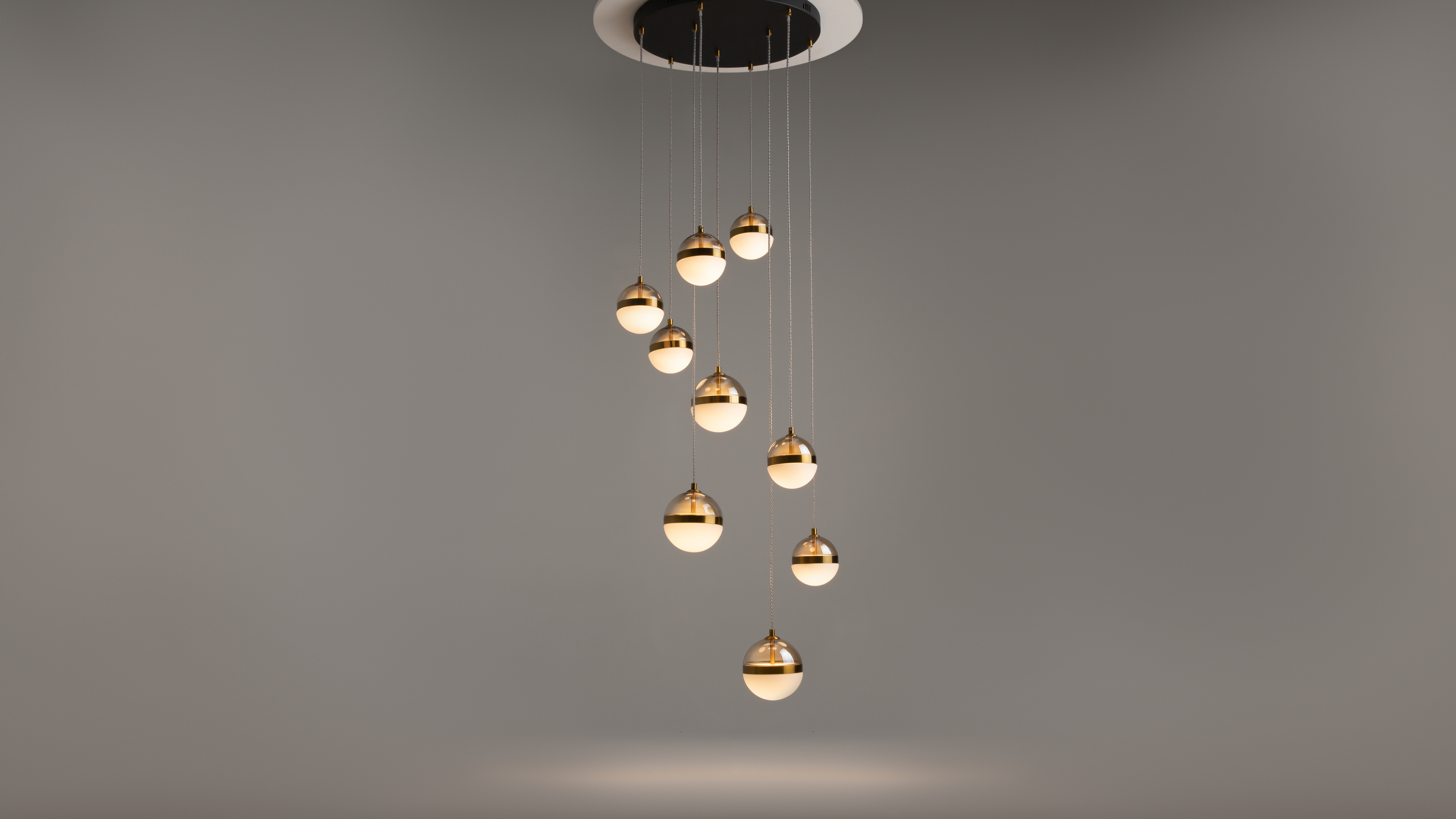 Плафоны с оригинальным исполнением состоят из двух стеклянных полусфер (матовой белой и тонированной янтарной), дополненных латунной разделяющей полосой с приятным блеском.