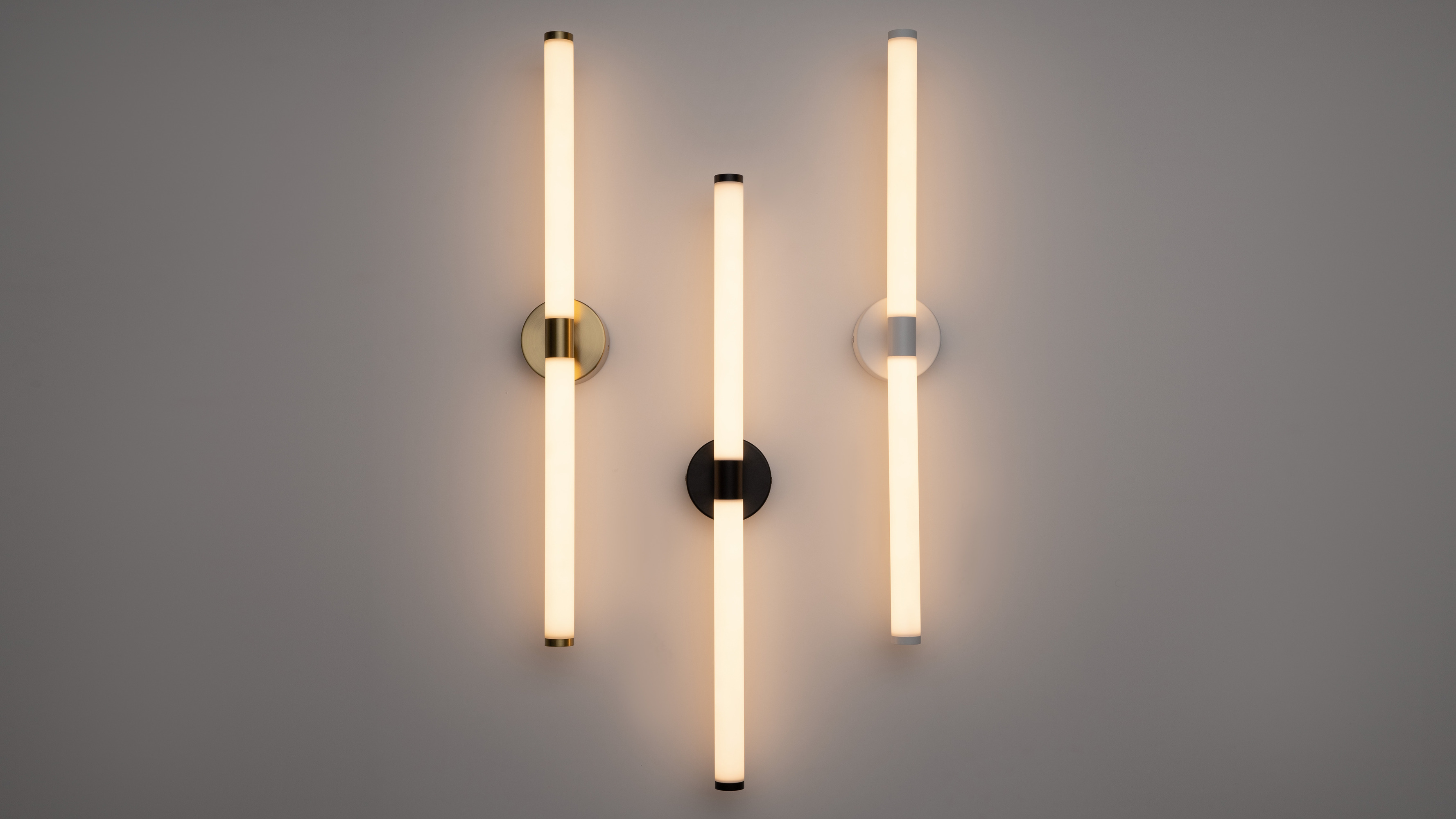 Прямые линии-лампы пересекаются в разных точках в зависимости от угла обзора. В каждом луче скрыт LED-элемент, свет от которого плавно и равномерно распределяется при помощи акрилового рассеивателя. В серии представлены бра высотой 630 мм в 3 цветах арматуры: белый, черный и золотой, и бра высотой 356 мм в цвете латунь.