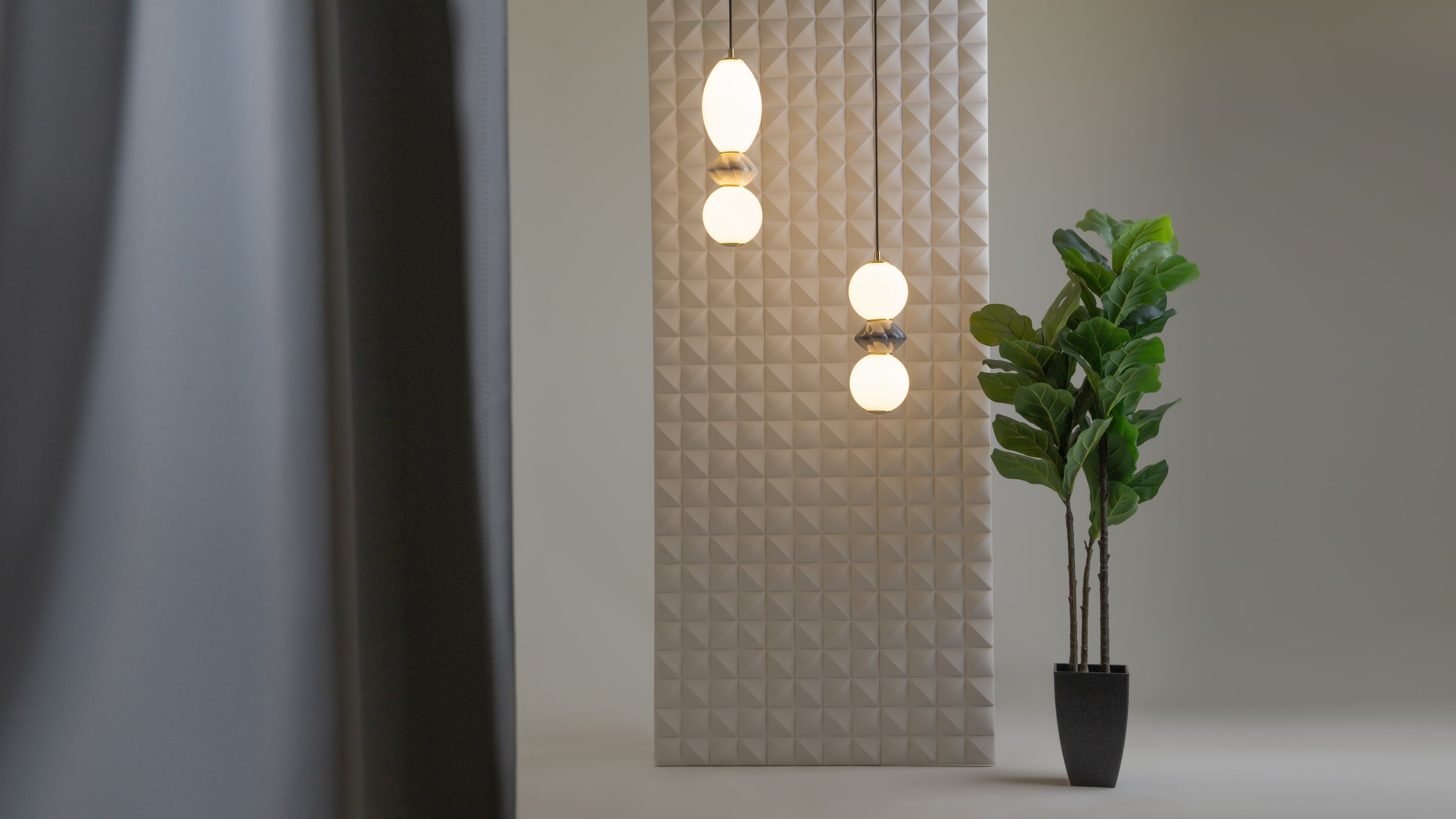 В серии представлены подвесные светильники двух типов, настенный светильник (бра) и настольный светильник.Уникальной чертой серии является декоративный элемент в виде фигурной бусины с вертикальным рельефом, изготовленной из натуральной керамики. Бусина покрыта глянцевой глазурью и доступна в двух цветовых решениях: кремово-белый (RAL 9001) и серебристо-серый (RAL 7001). В сочетании с металлической арматурой цвета сатинированной латуни и молочно-белыми плафонами из глянцевого стекла.
