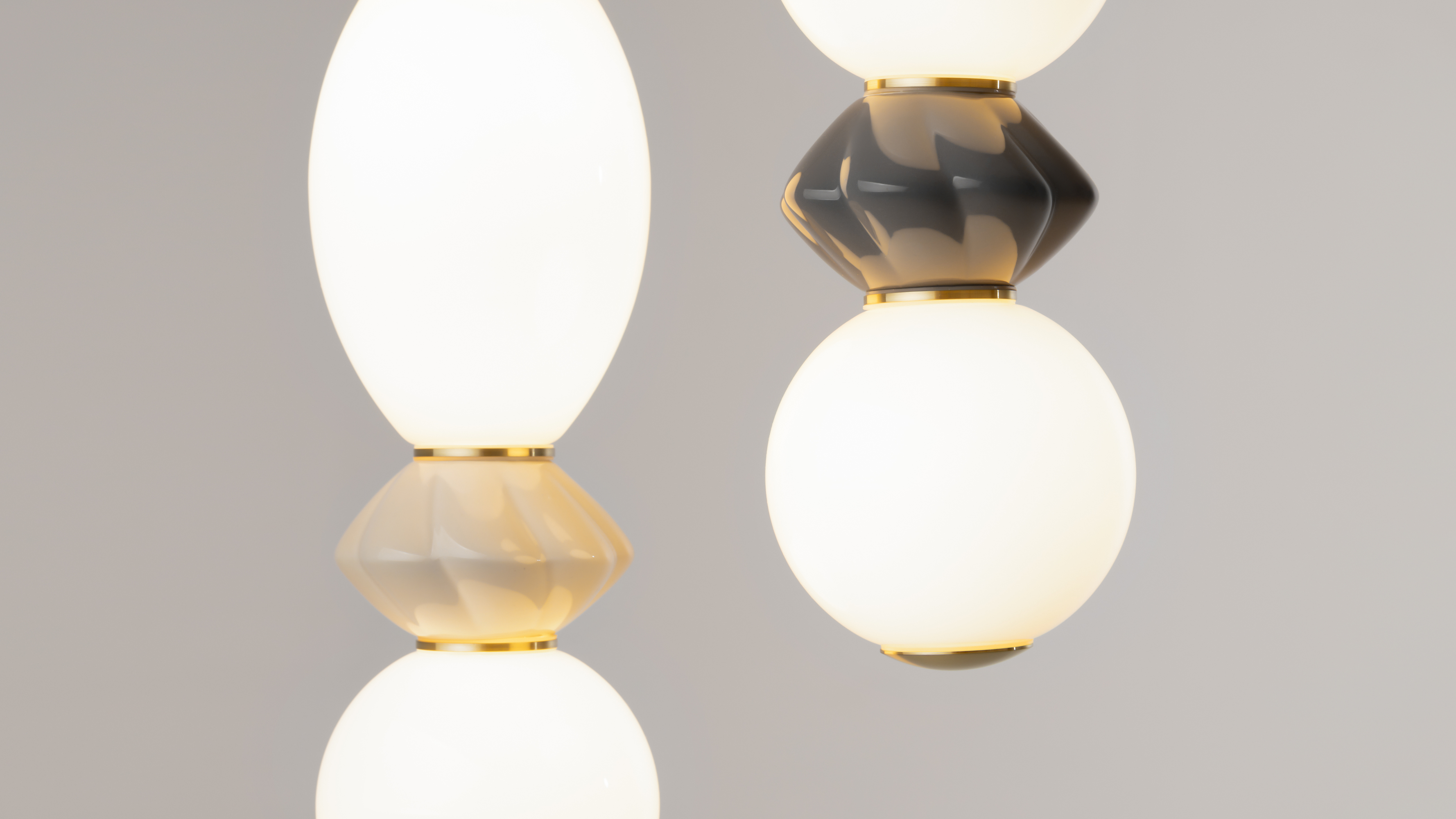 Кремовые и серые оттенки керамики прекрасно сочетаются друг с другом, что даёт возможность составлять каскадные композиции с несколькими подвесными светильниками в качестве дополнительного или основного источника света.
