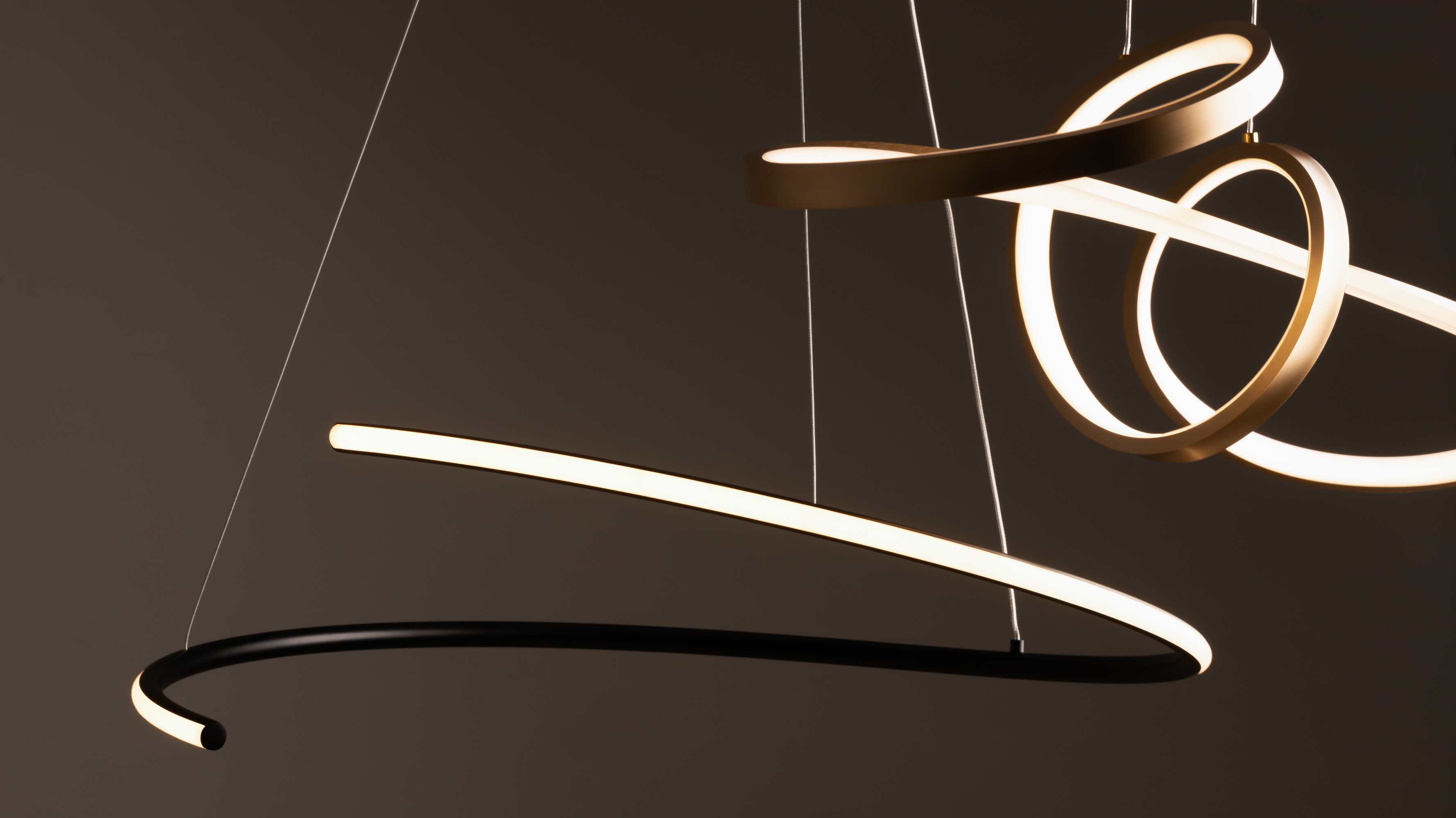Оригинальные силуэты светильников серии Curve создают эффект движущегося света. Плавные округлые линии и незаметные тросы формируют иллюзию невесомости света, балансирующего в воздухе.