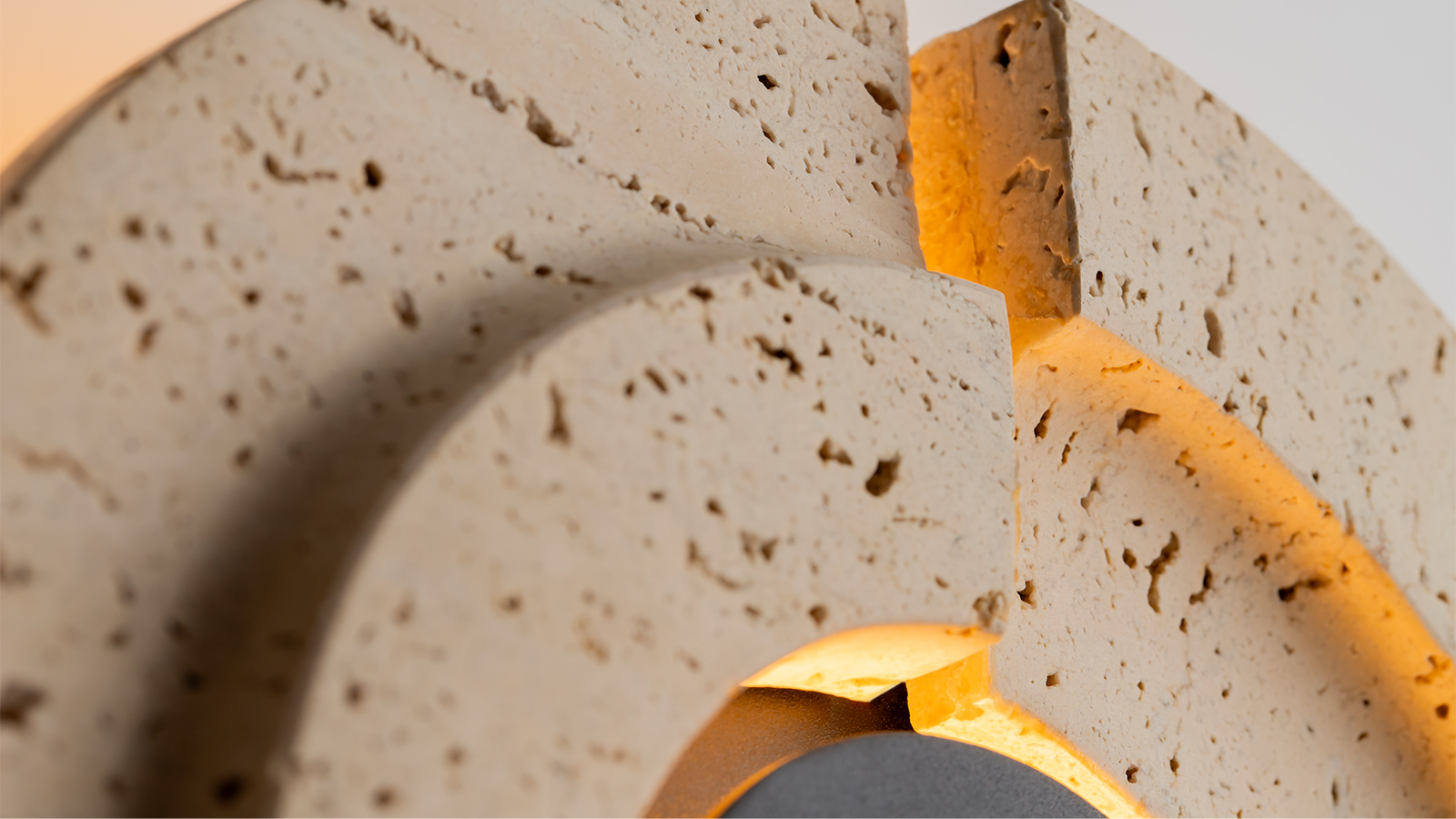 Центральным элементом дизайна стал травертин, чья пористая текстура и природный бежевый оттенок визуально отсылают к песчаным дюнам. Каждый светильник уникален благодаря сложному архитектурному рельефу на срезе натурального камня. LED-источник света с температурой 3000К обрамляет и подсвечивает внутренние грани травертина, а также создаёт мягкий световой ореол на стене, усиливая эффект глубины и таинственности.