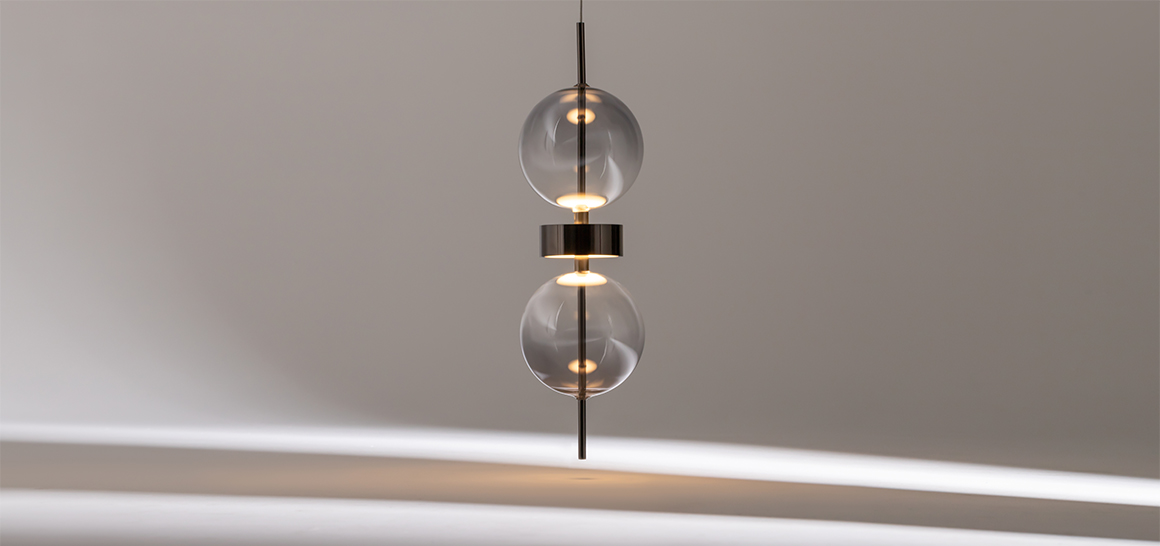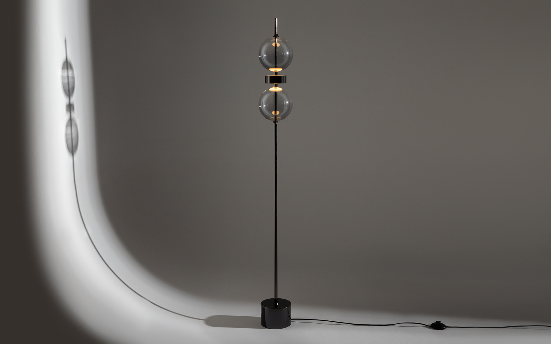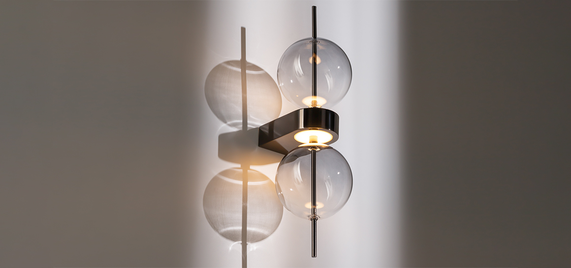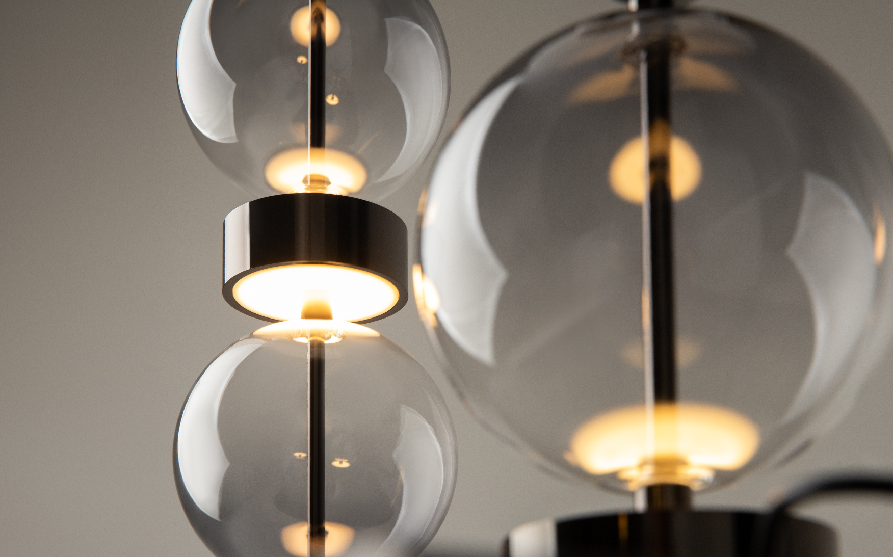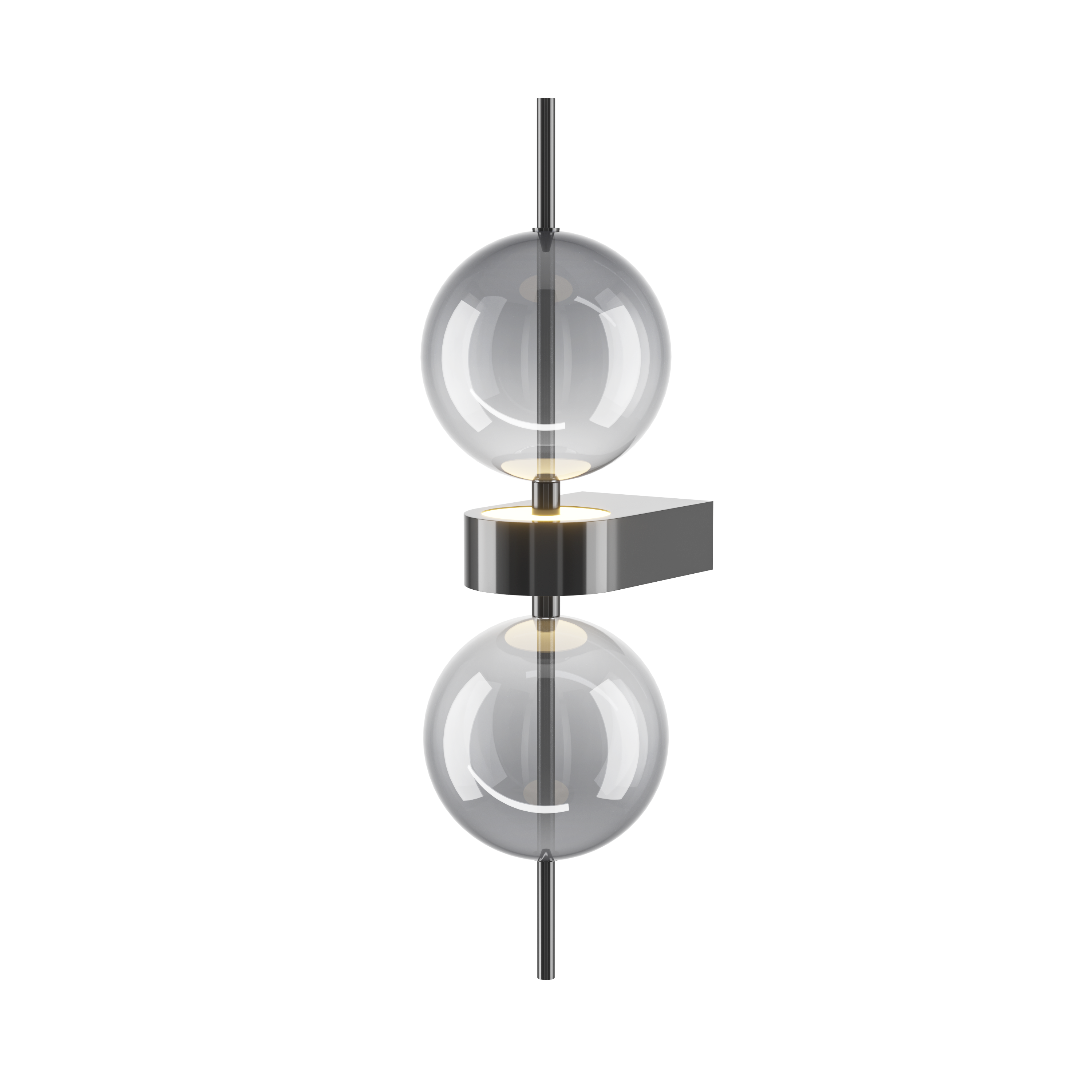 Основной акцент серии - стеклянные шары с тонированным зеркальным градиентом, сияние которых подчеркивает черная глянцевая арматура.