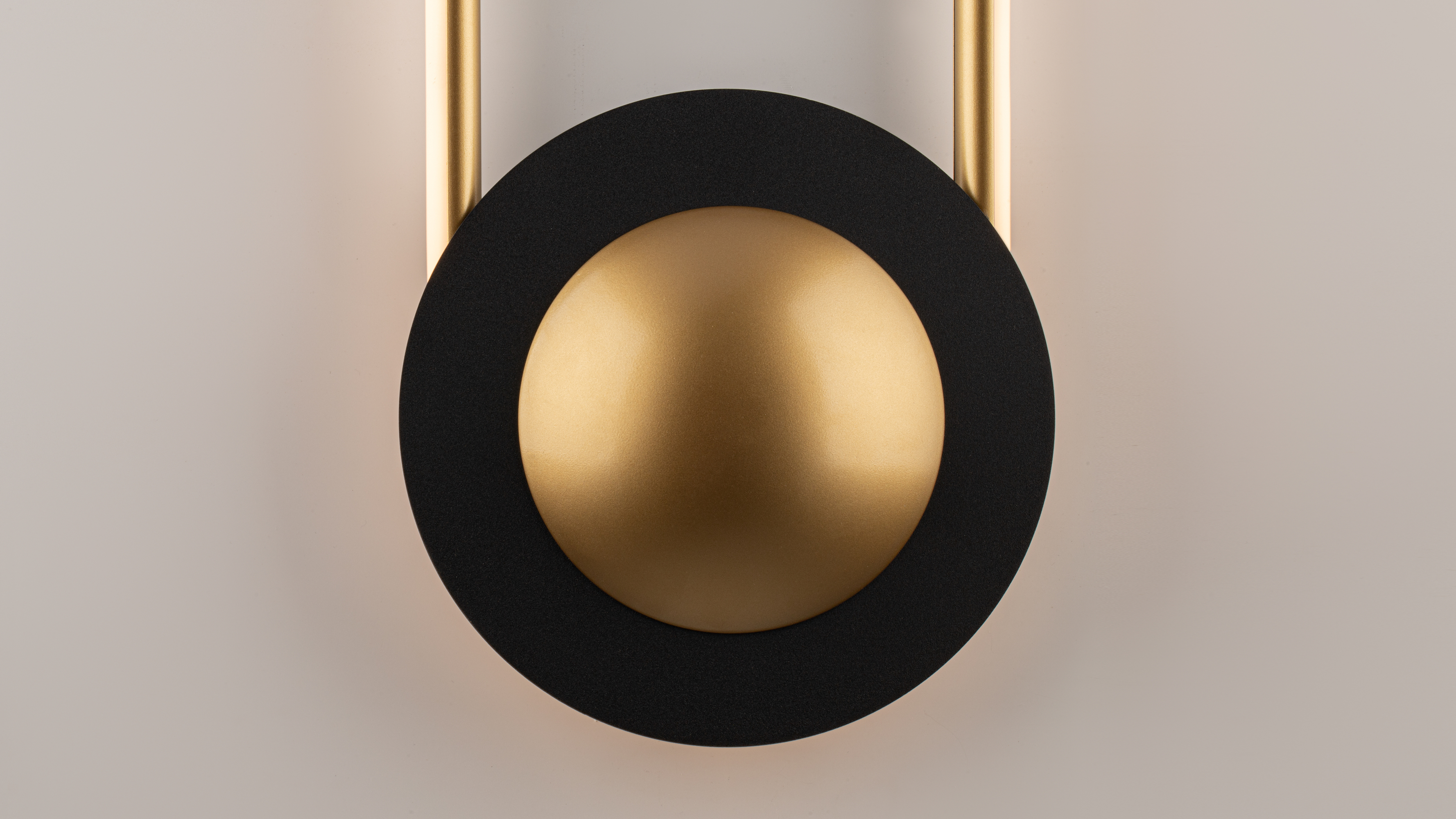 Сочетание арматуры в цвете латунь с контрастными черным элементасми делает светильники яркими акцентами в интерьере.