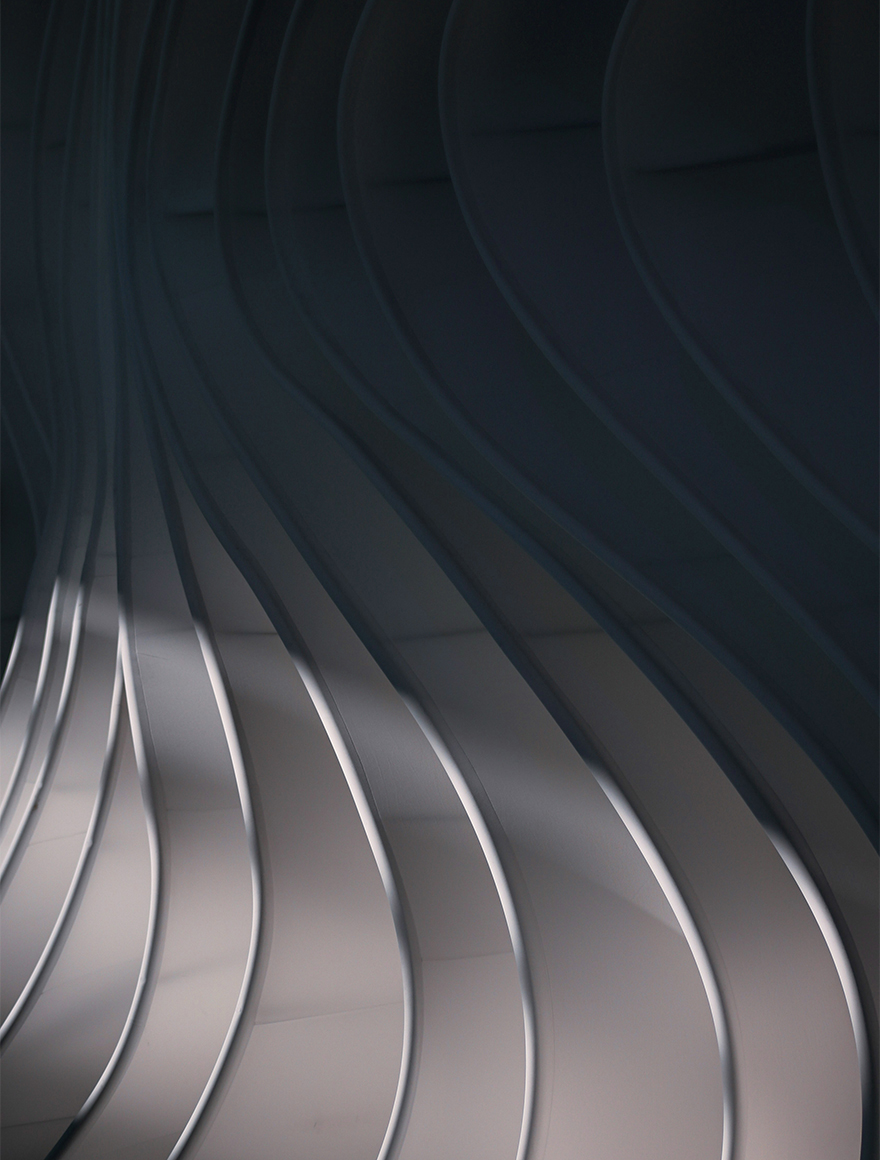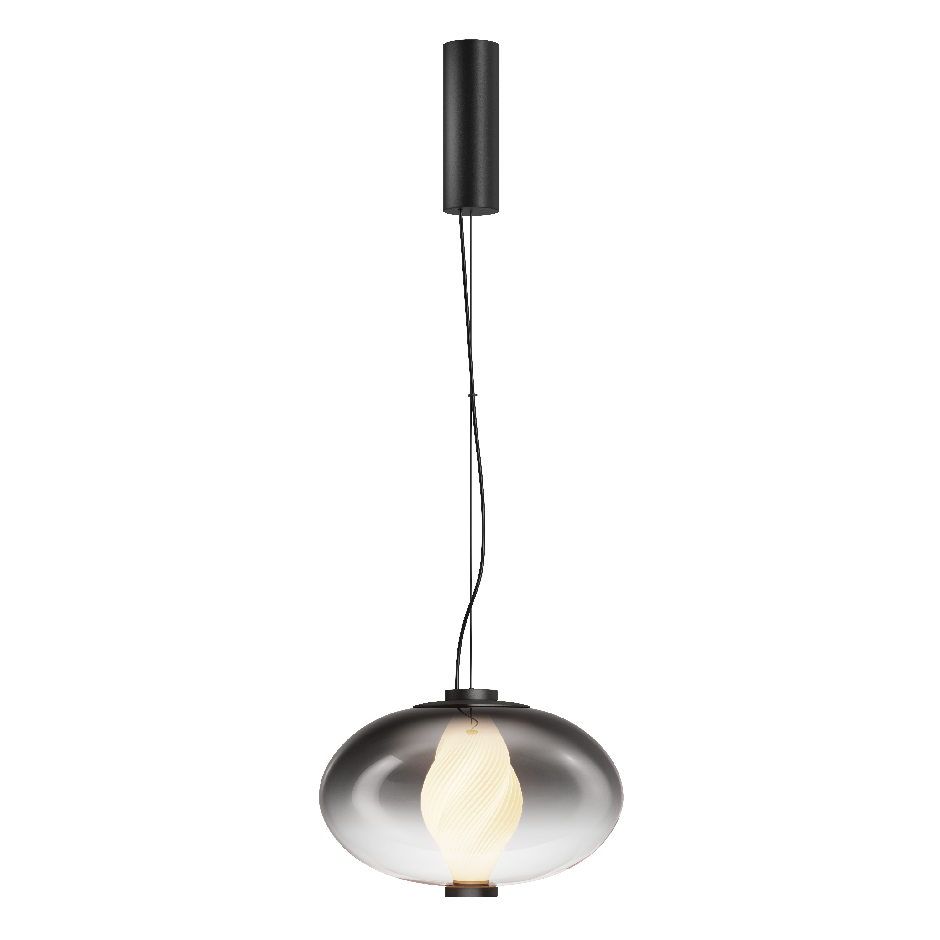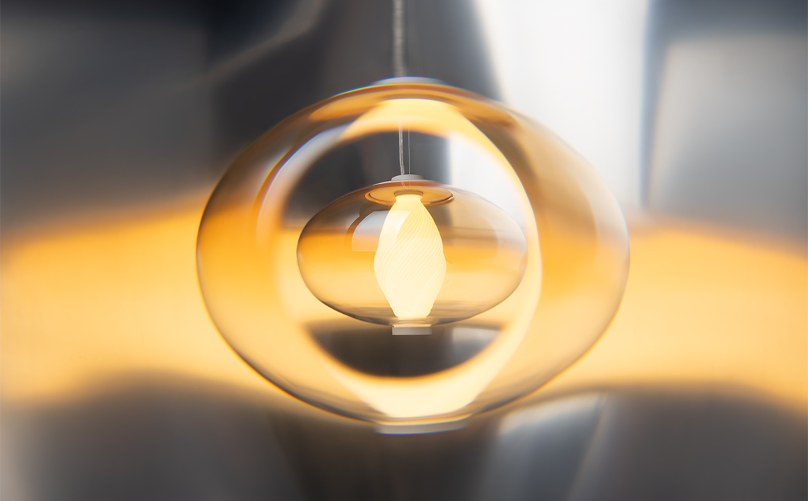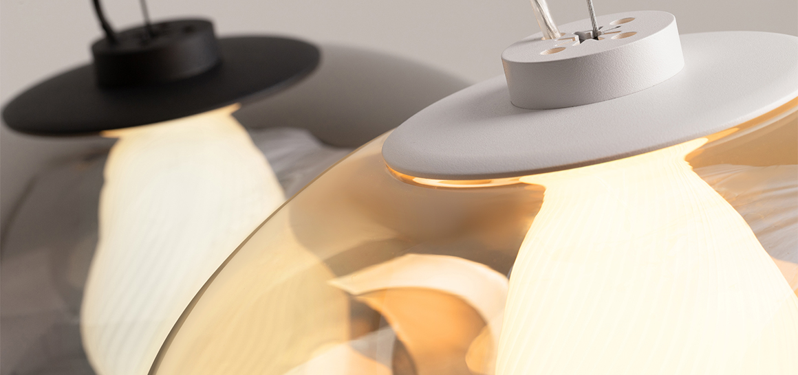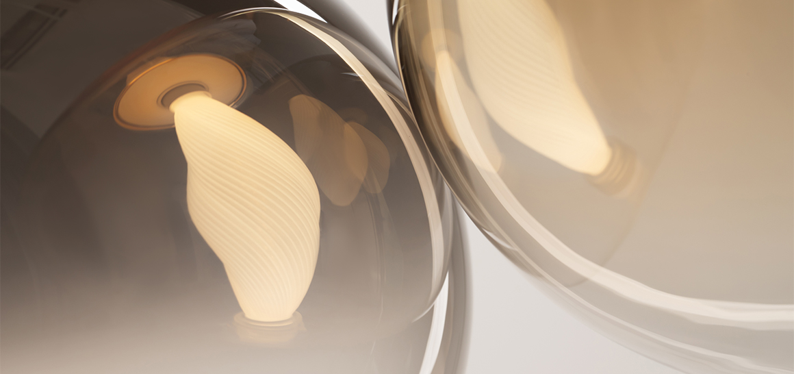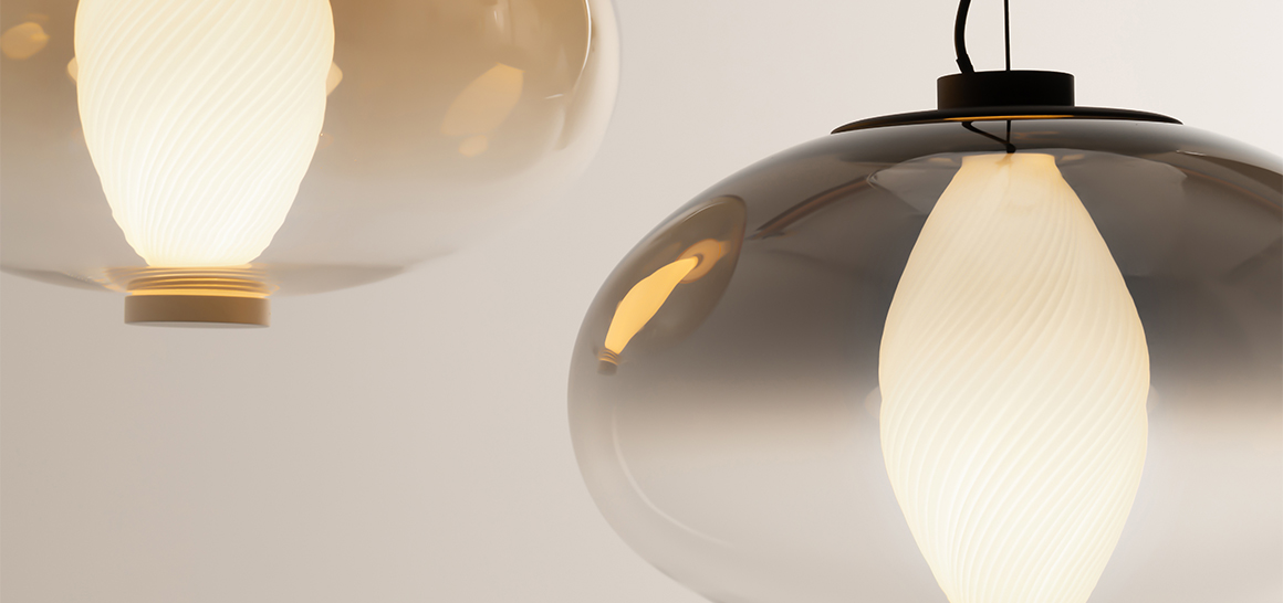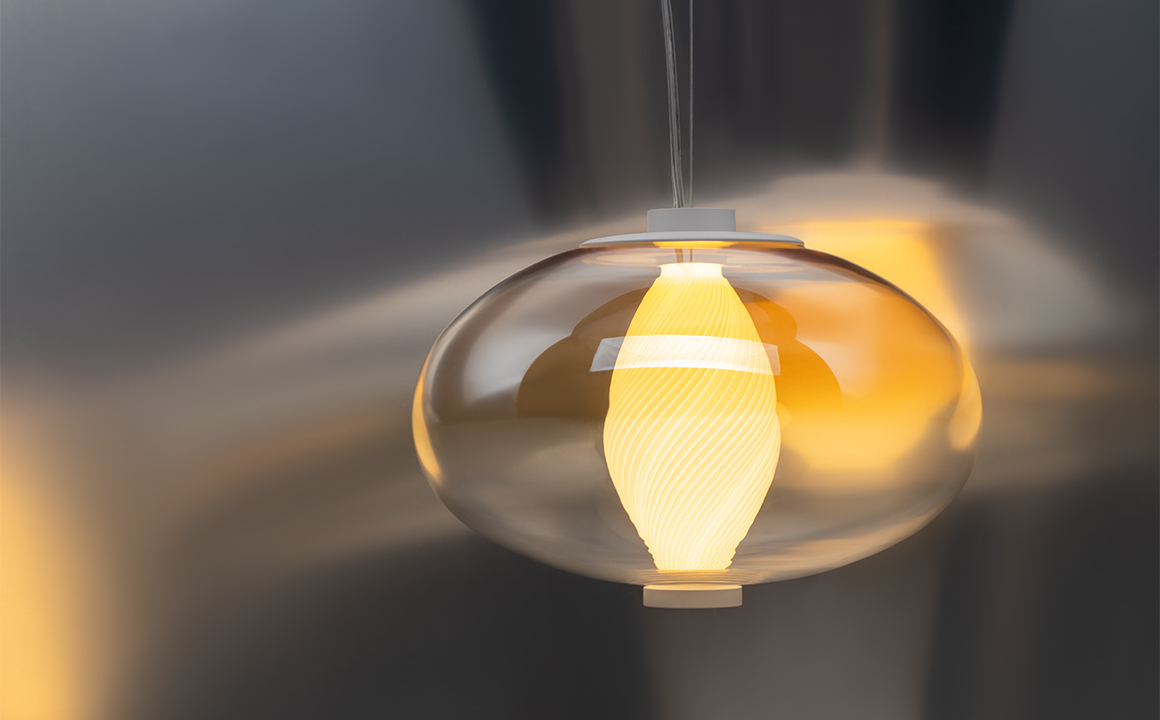 В центре светильников находится спиралевидный орнамент. Технологии 3D-печати детализировали динамичный орнамент, который окутан стеклом – преемником традиций муранских стеклодувов.