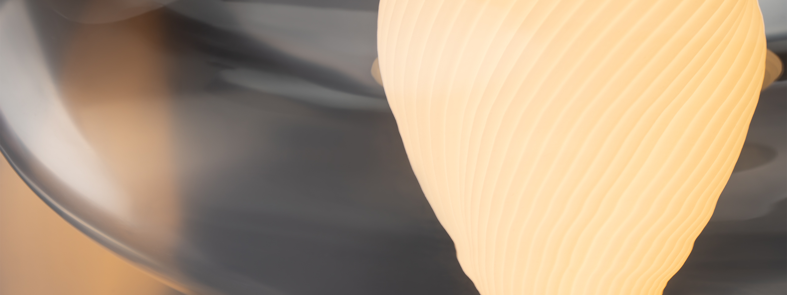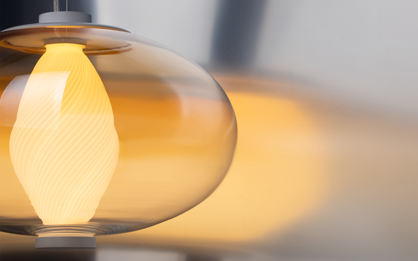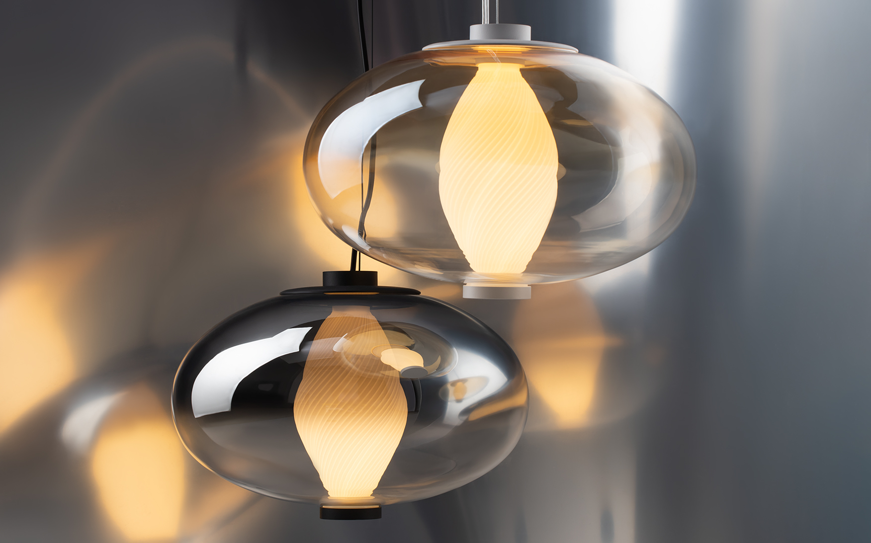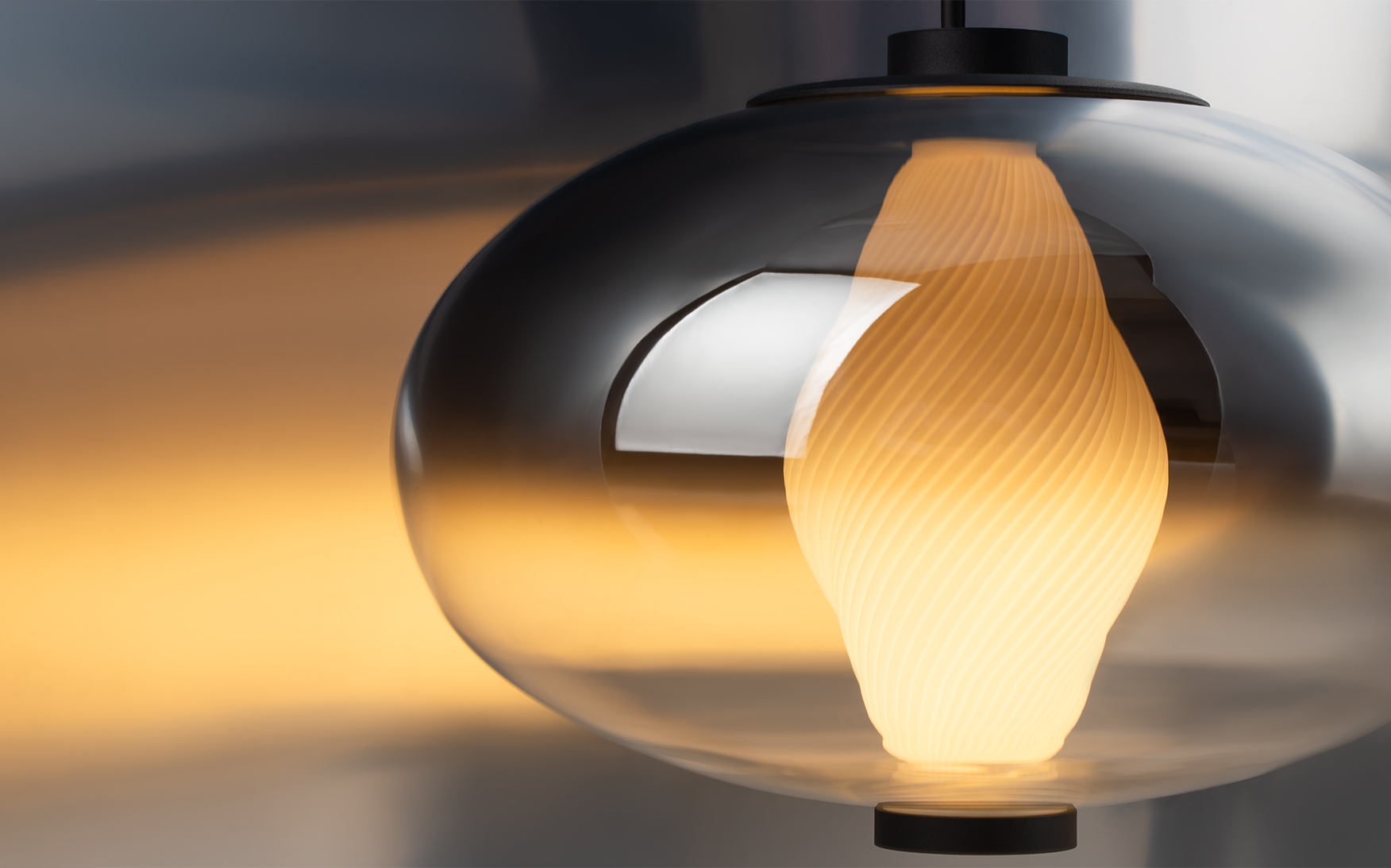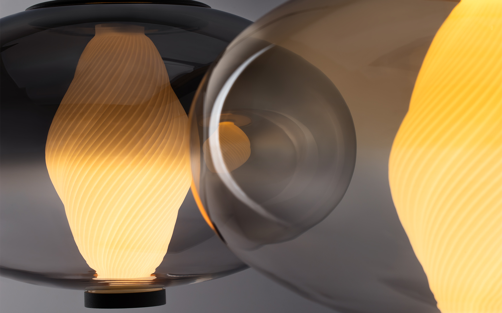 В центре светильников находится спиралевидный орнамент. Технологии 3D-печати детализировали динамичный орнамент, который окутан стеклом – преемником традиций муранских стеклодувов.
