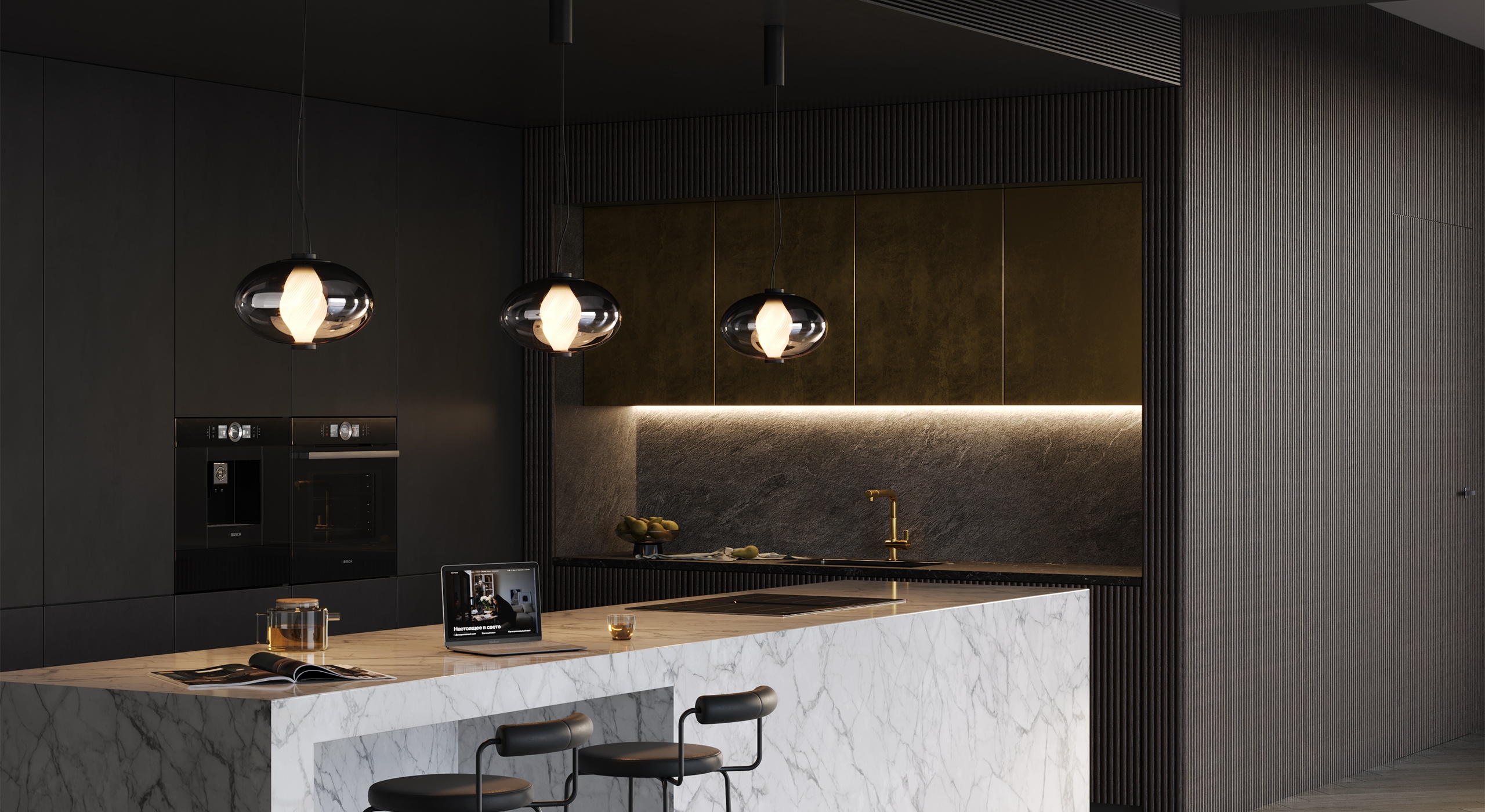 В дизайне гармонично сочетаются текстуры черной металлической арматуры с антибликовым покрытием, глянцевого выдувного стекла с градиентным окрашиванием и матовый пластик детализированного рельефа.