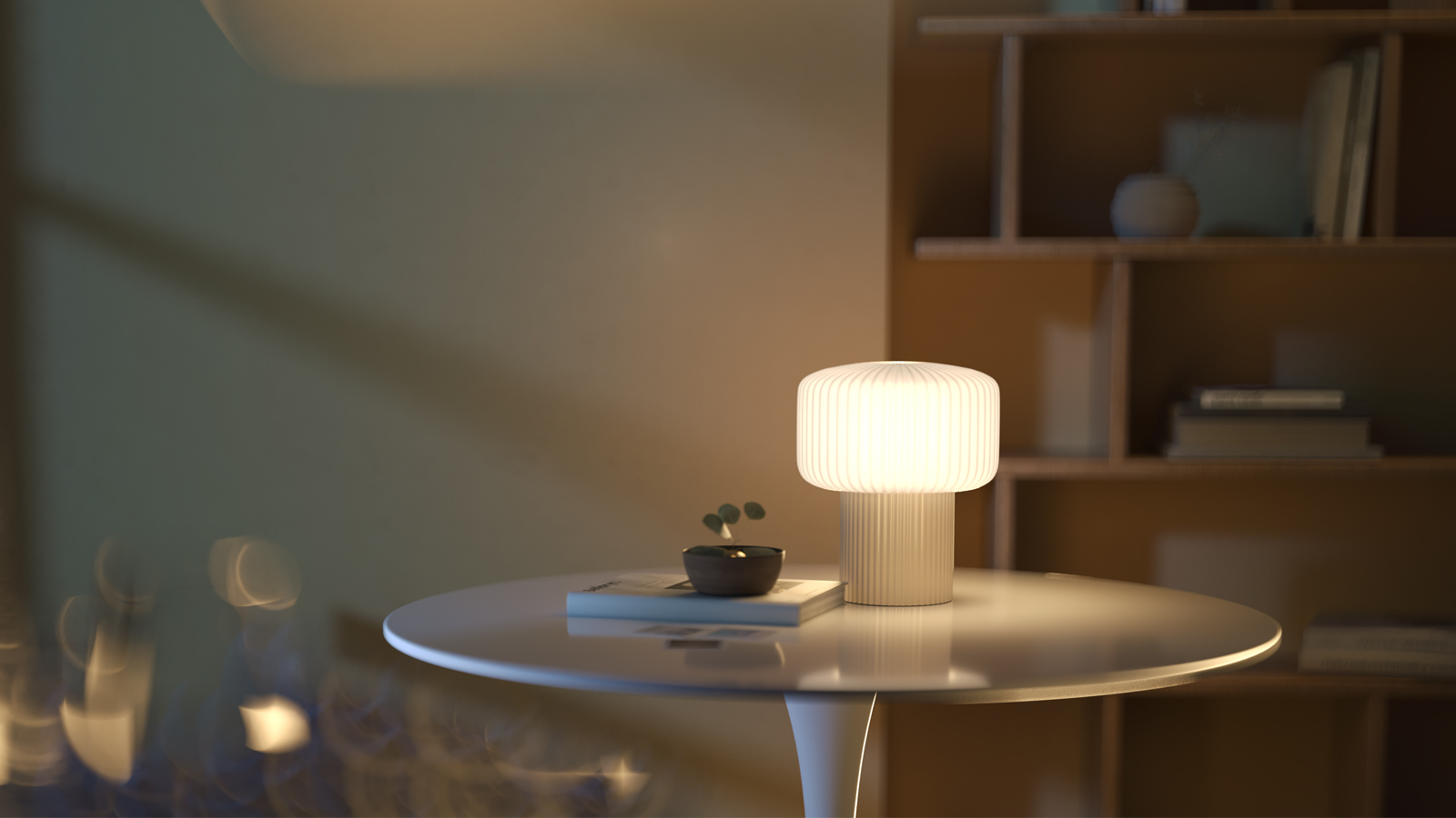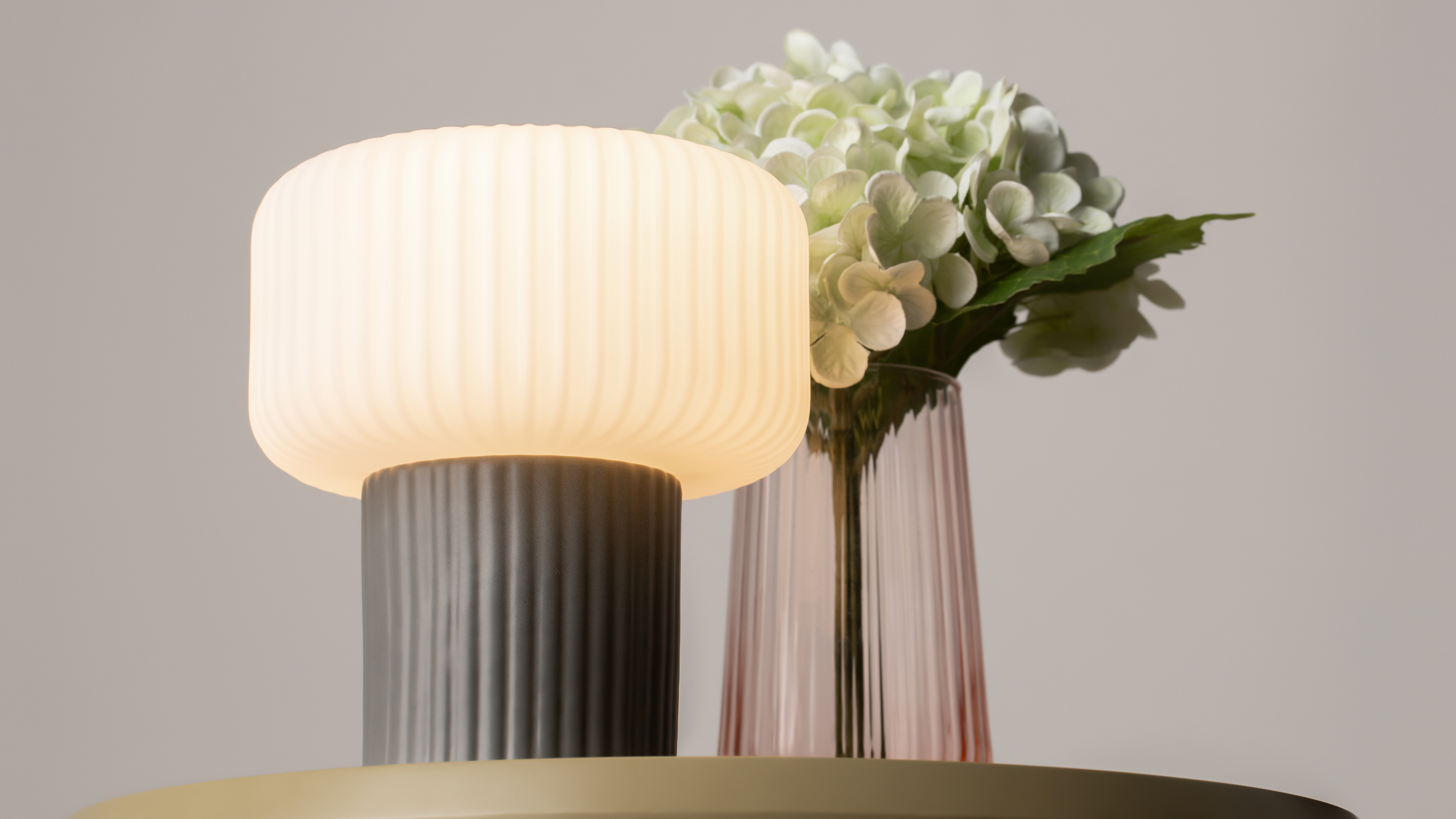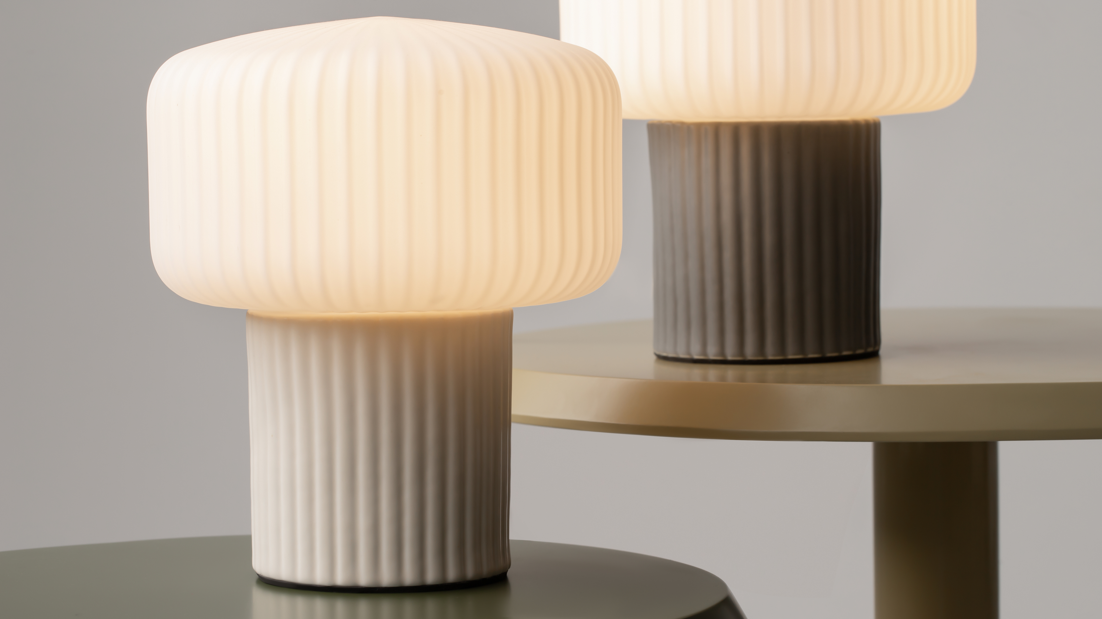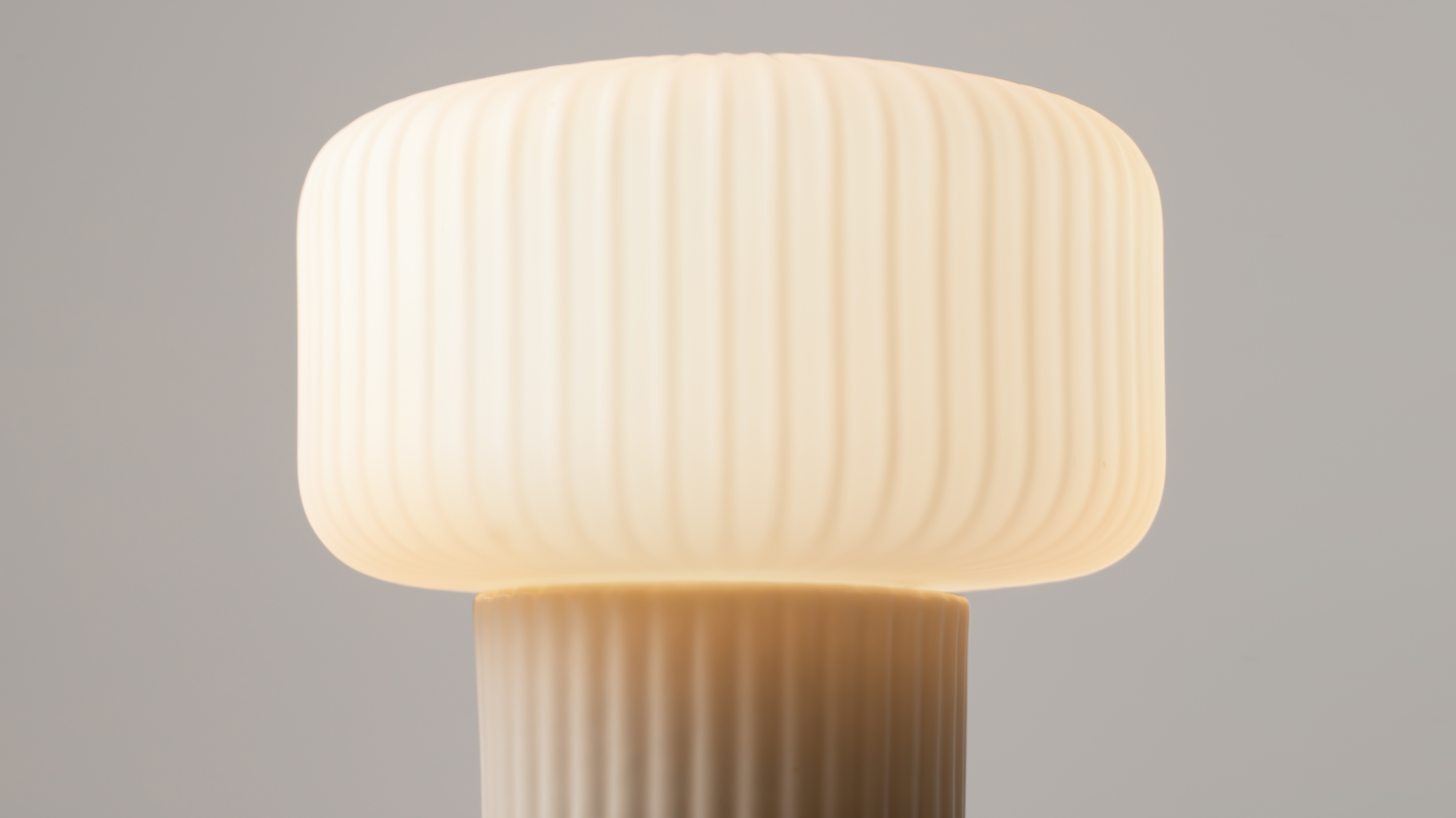 Керамическое основание и стеклянный плафон украшены аккуратным вертикальным рельефом, который станет деликатным акцентом в интерьере и привлечёт внимание. Сочетание белого матового стекла плафона и керамического основания, покрытого матовой глазурью, формирует тактильную и визуальную эстетику. В серии представлены два пастельных оттенка керамики: кремово-белый (RAL 9001) и серебристо-серый (RAL 7001).