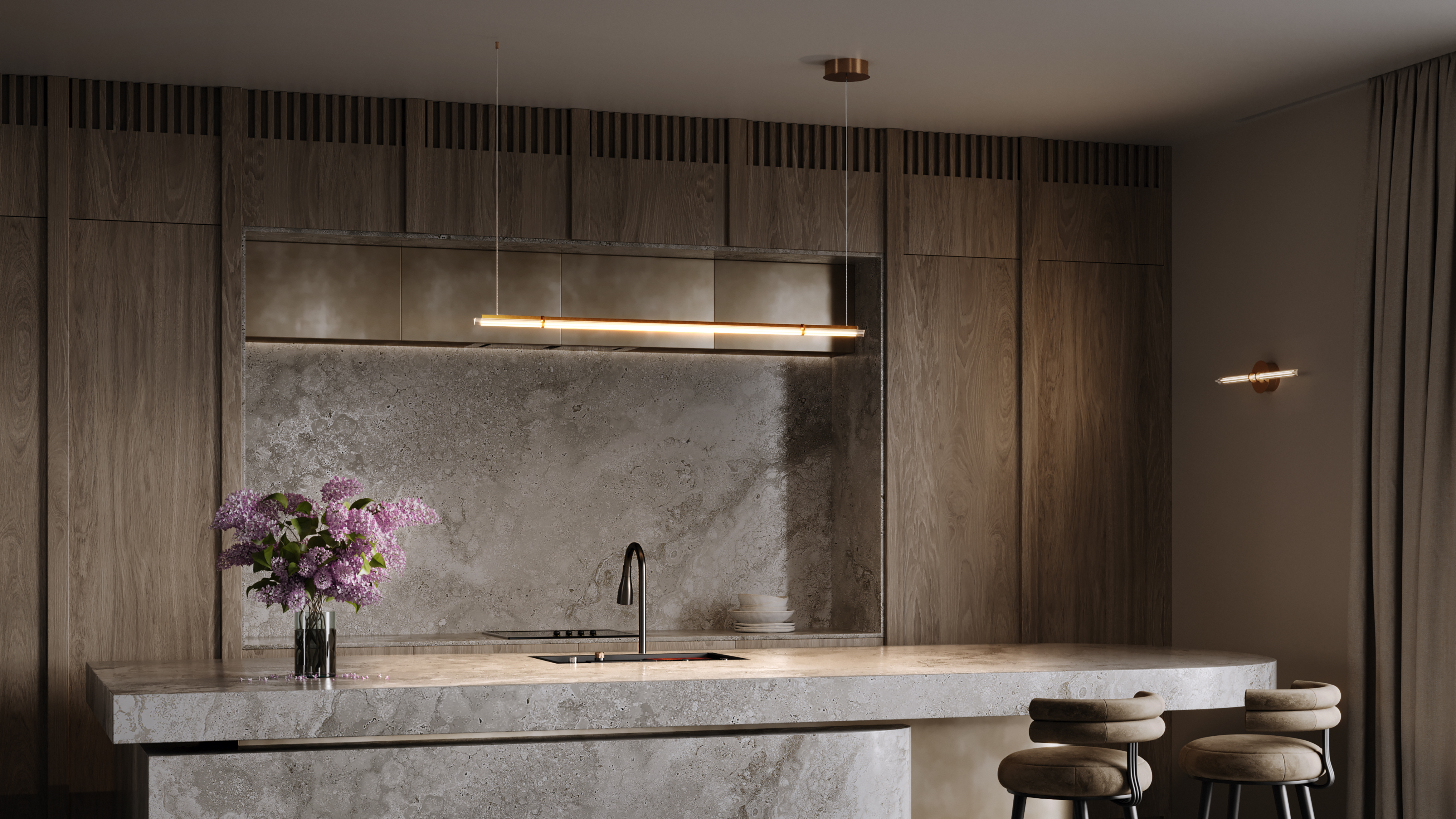 Светильники в виде тонких трубок из рифленого стекла создают изящный световой шлейф, органично дополняющий минималистичное оформление пространства.