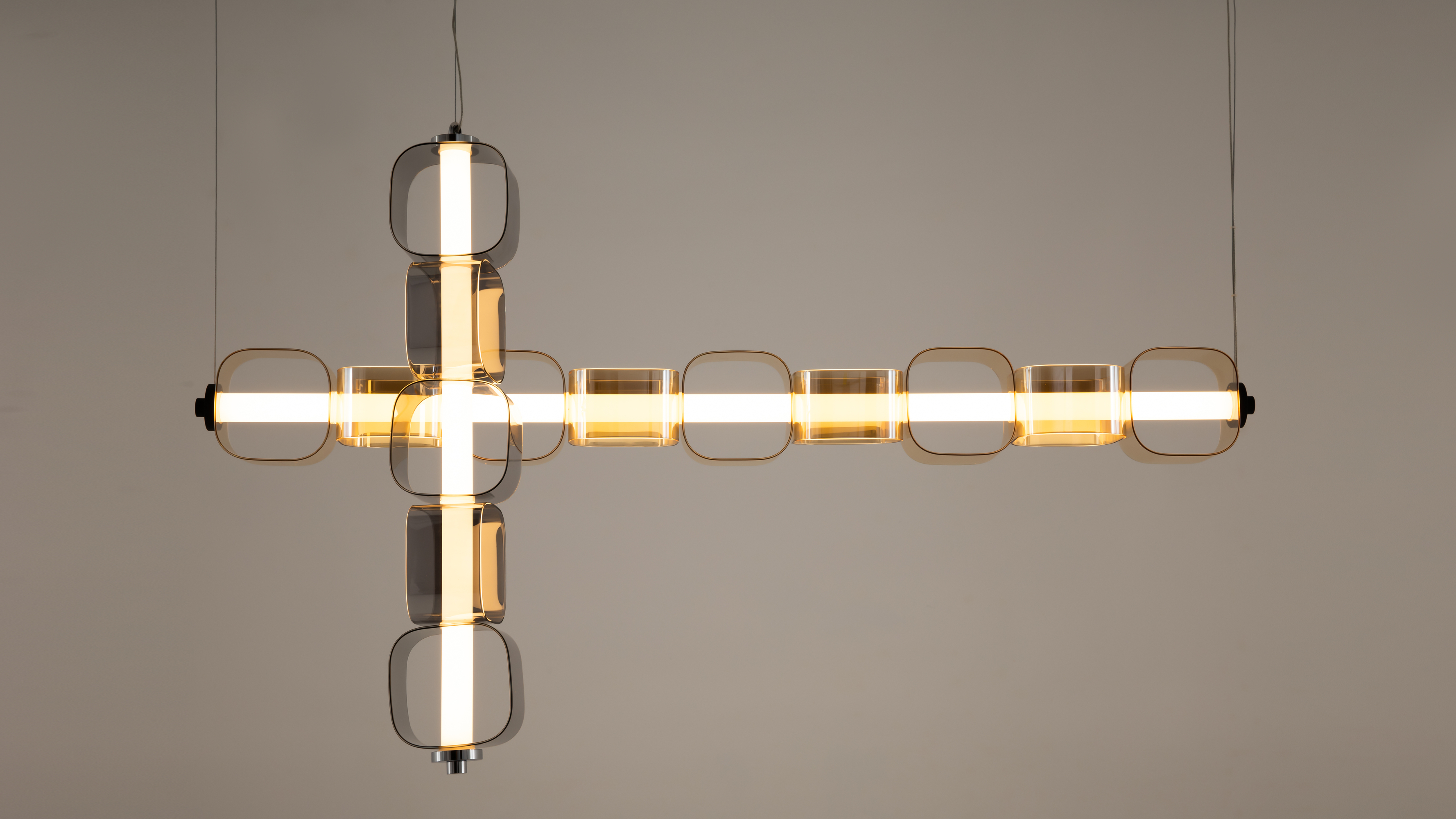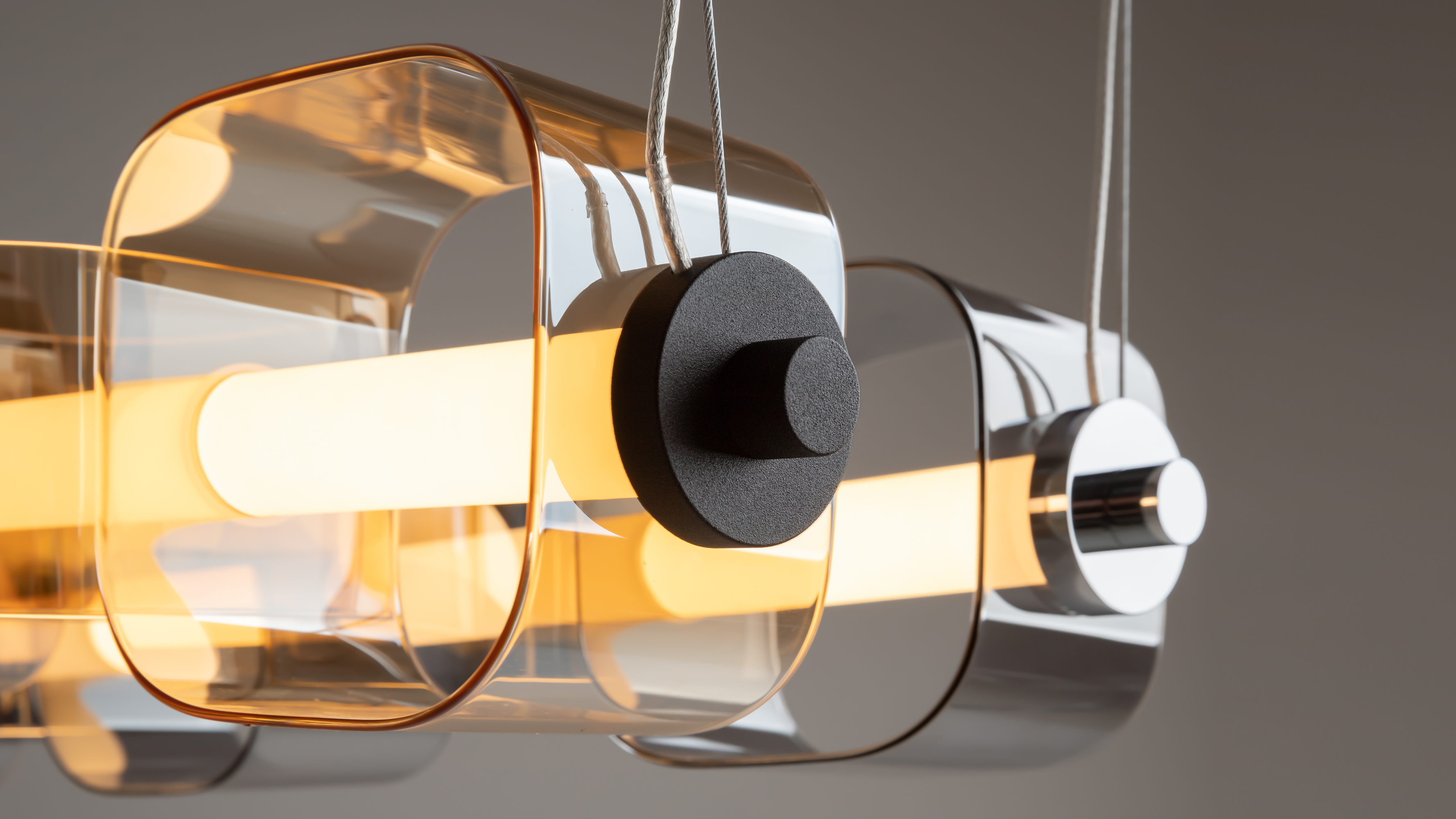 Серия представлена вертикальными и горизонтальными светильниками, доступными в двух цветовых решениях. Тонированные стеклянные плафоны в сером и янтарных тонах. Контрастная арматура в глянцевом хроме или черном цвете с сэнди-эффектом подчеркивает ультрасовременный характер.
