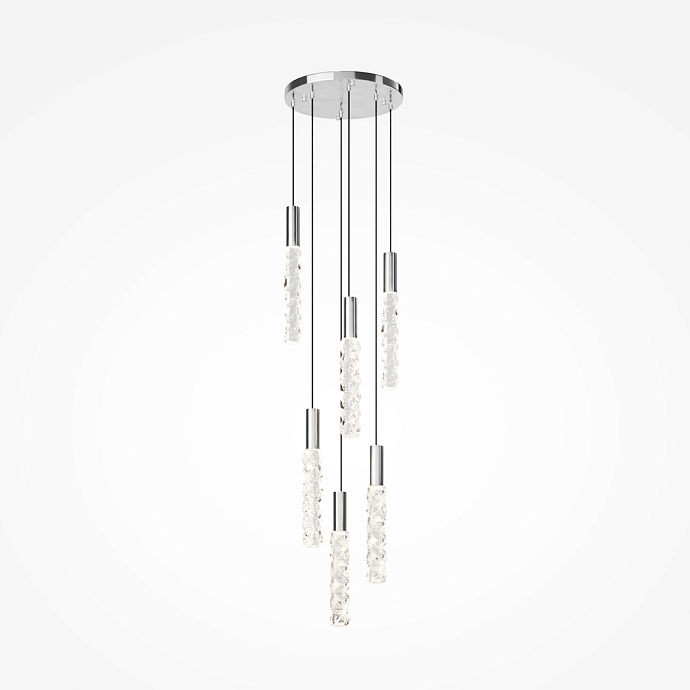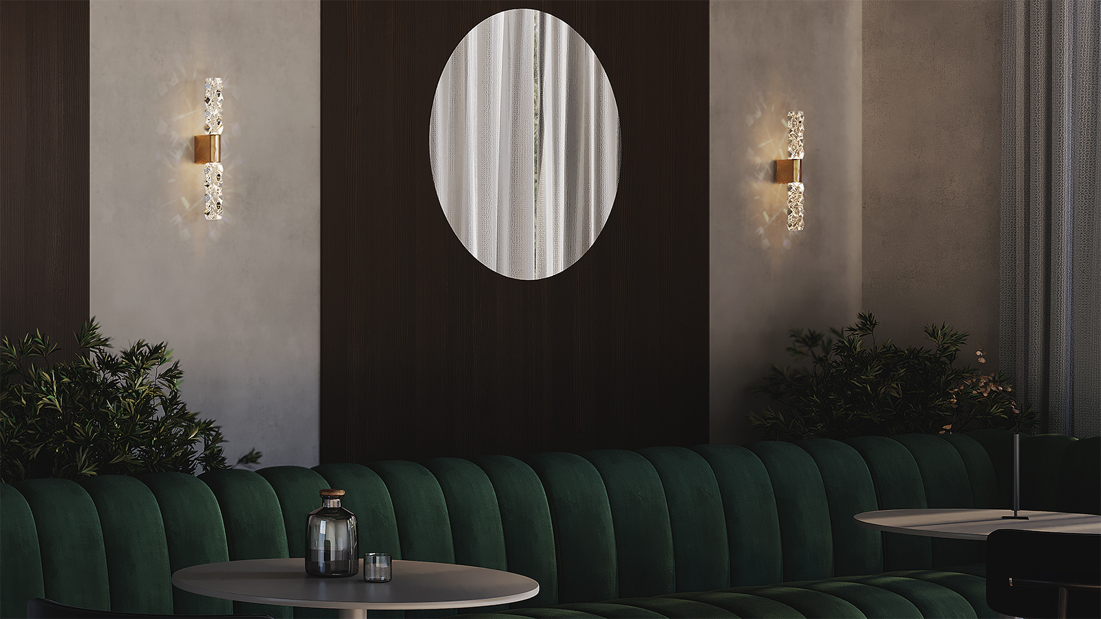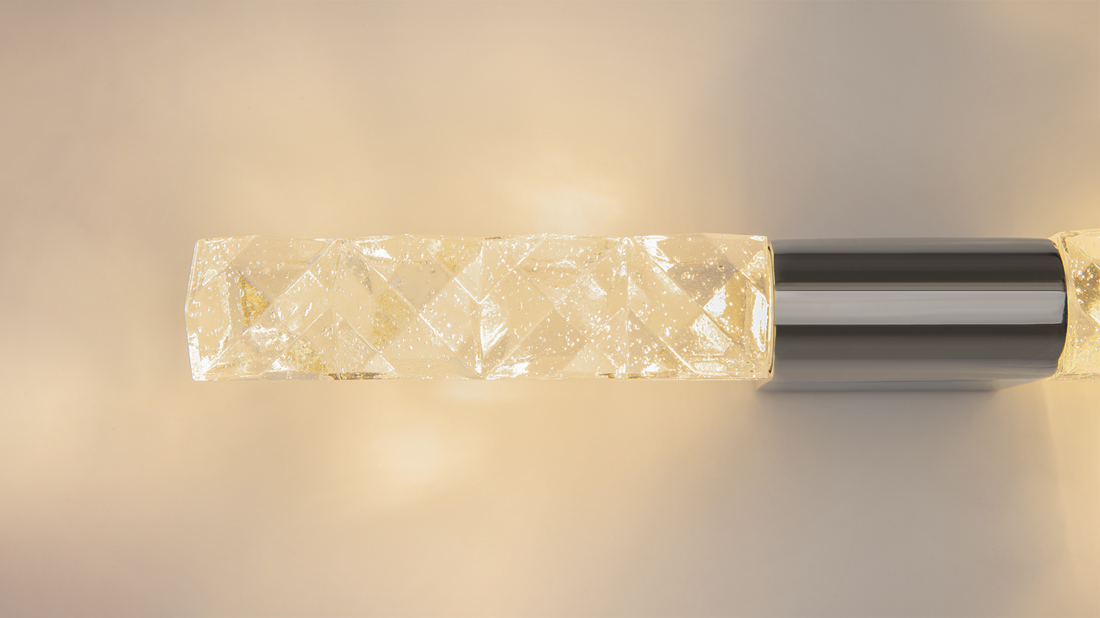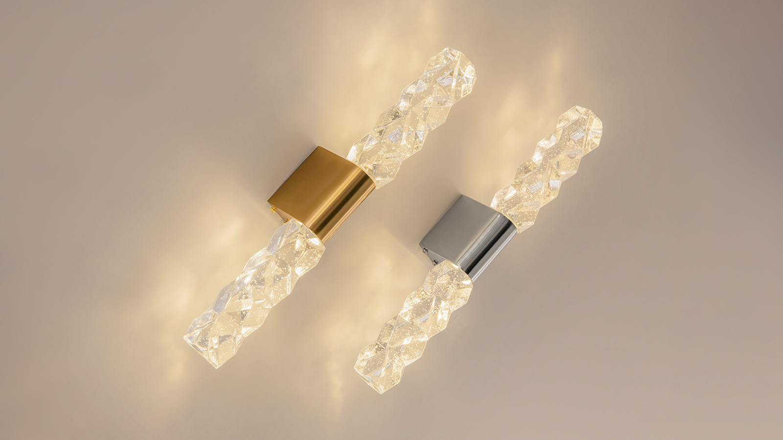 Рельефные хрустальные плафоны с изысканным зигзагообразным орнаментом хорошо освещают пространство, создают на стенах живые, геометрические световые узоры, превращая каждый уголок в сцену для незабываемого праздника жизни. Доступные в двух классических цветах — сияющем хроме и теплой латуни.