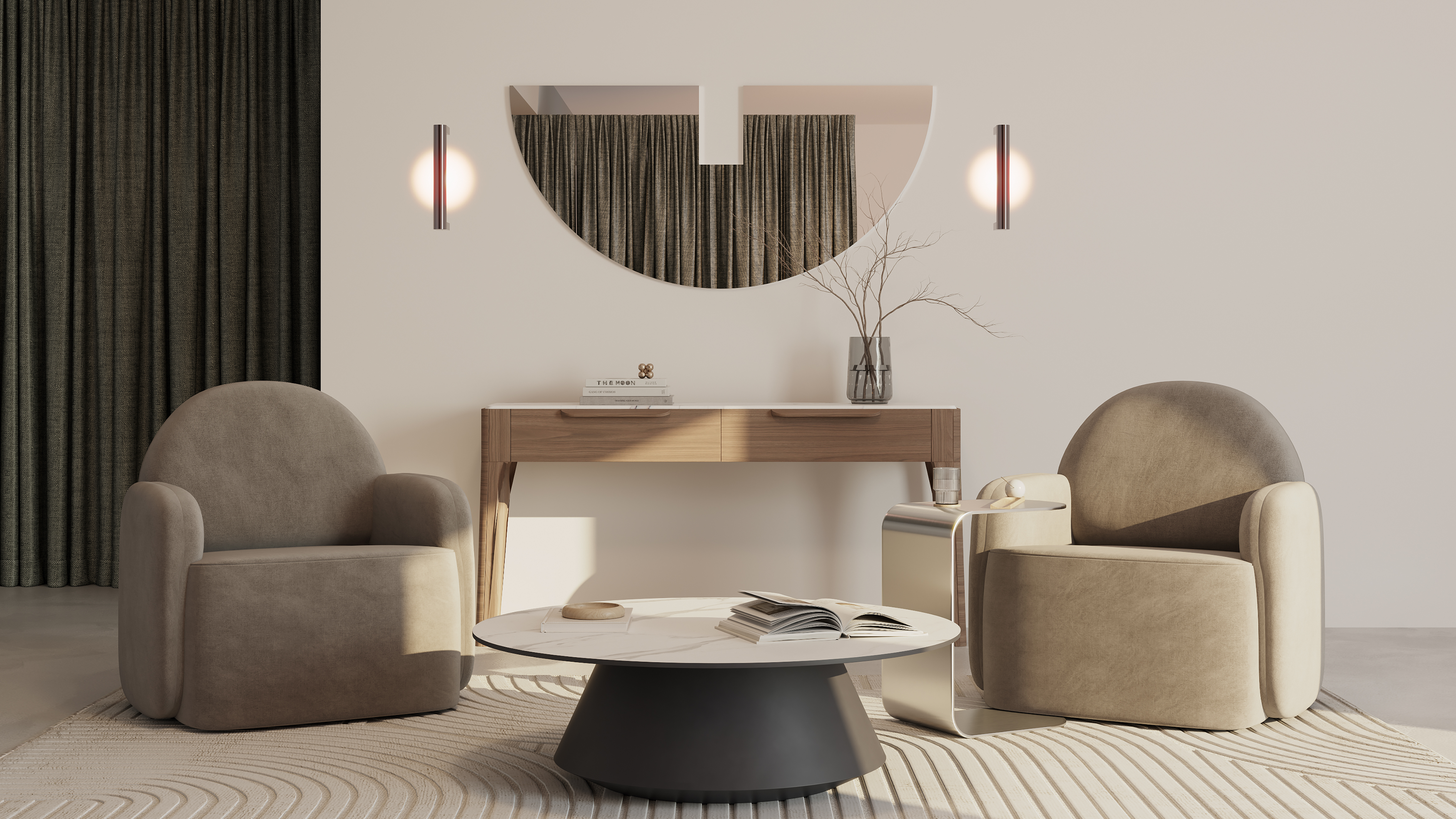 В дизайнерском решении использован переотраженный свет, создающий акцентный круг света на стене с деликатным свечением. Глянцевая полузеркальная поверхность арматуры, отражаясь и бликуя, делает светильник визуально тоньше.